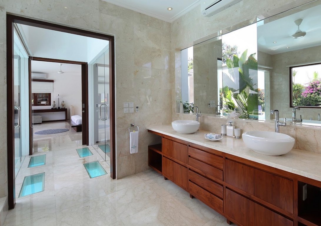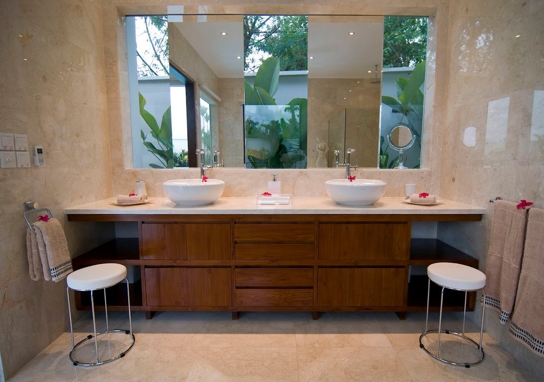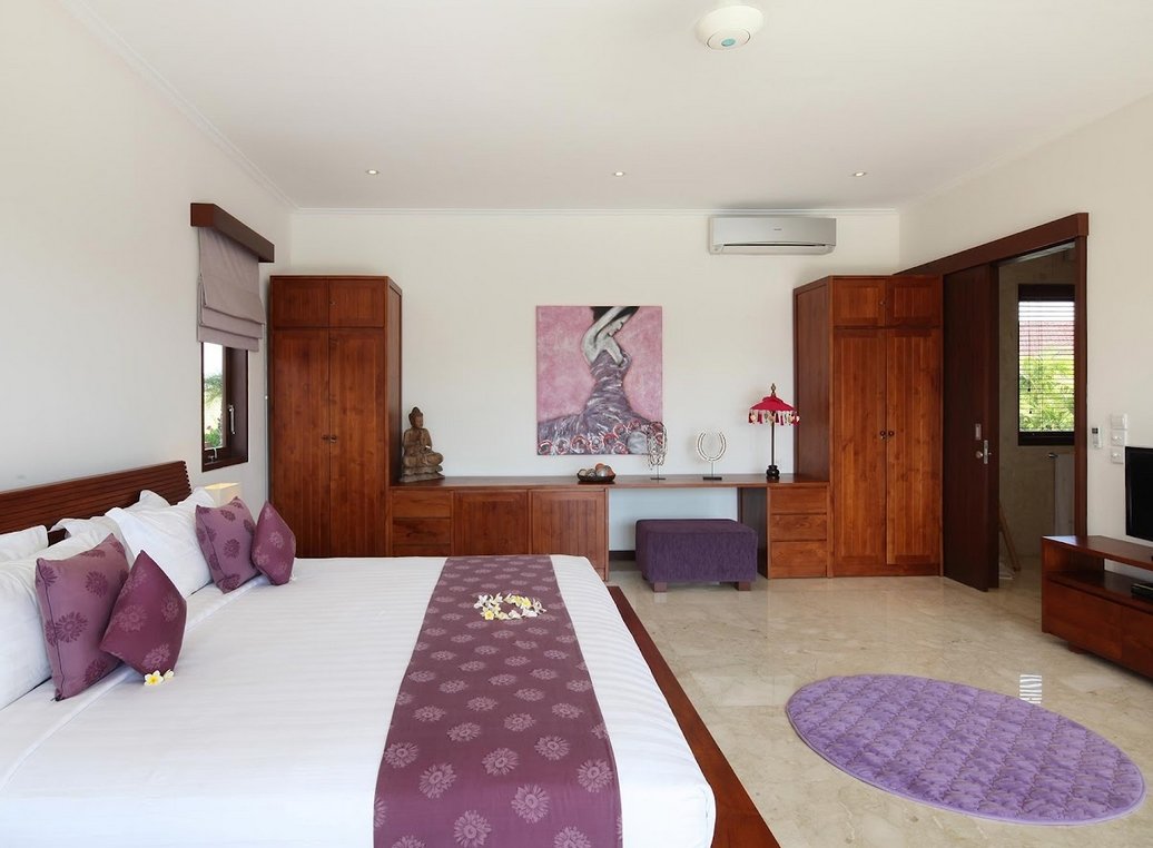 All five roomy bedrooms are air-conditioned and include modern style décor and furniture. Four rooms offer queen size beds while one with a two single bed, dresser and large glass sliding doors that open out to balcony views or for ground floor rooms, garden and pool views. Located in Canggu, 2.6 km from Echo Beach, Villa provides a living room with a flat-screen TV. Guests may go for a swim in the private pool.