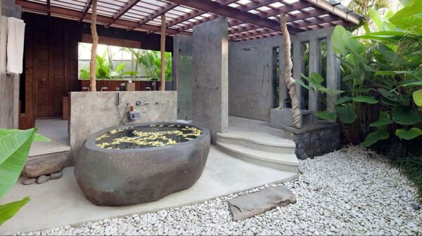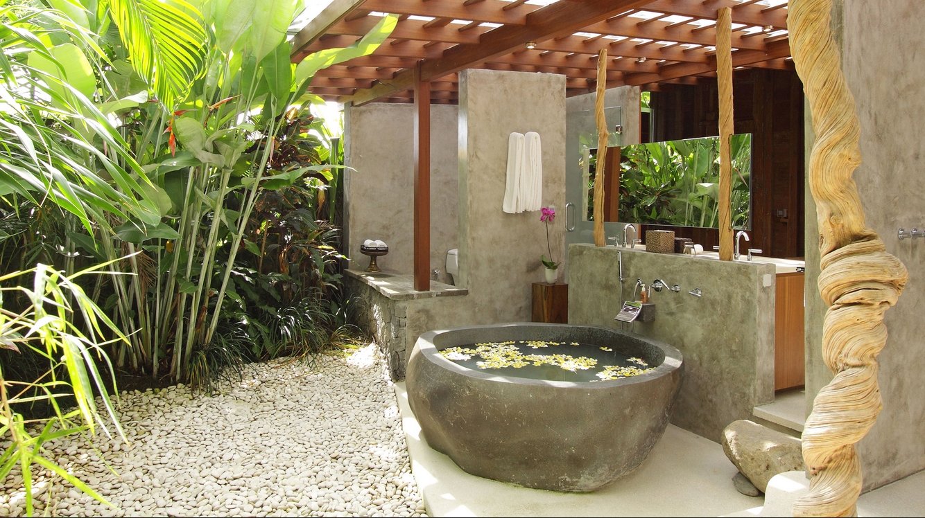 • Open-air garden bathroom with rain shower