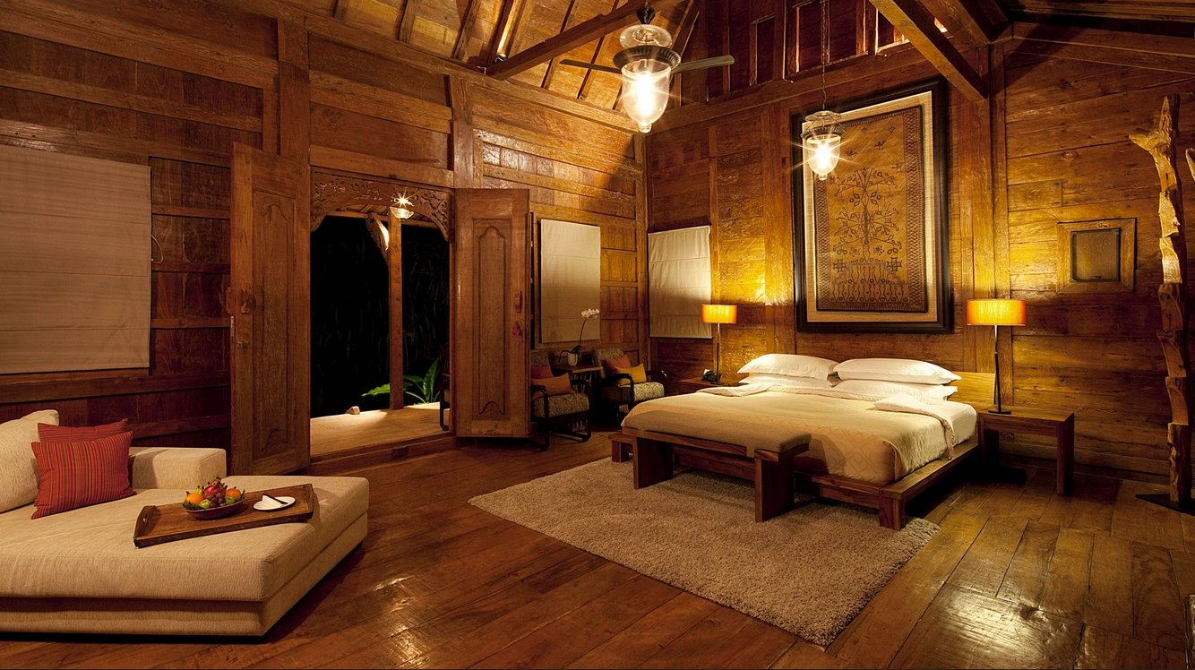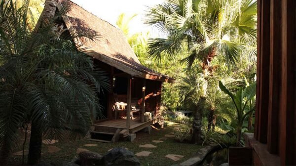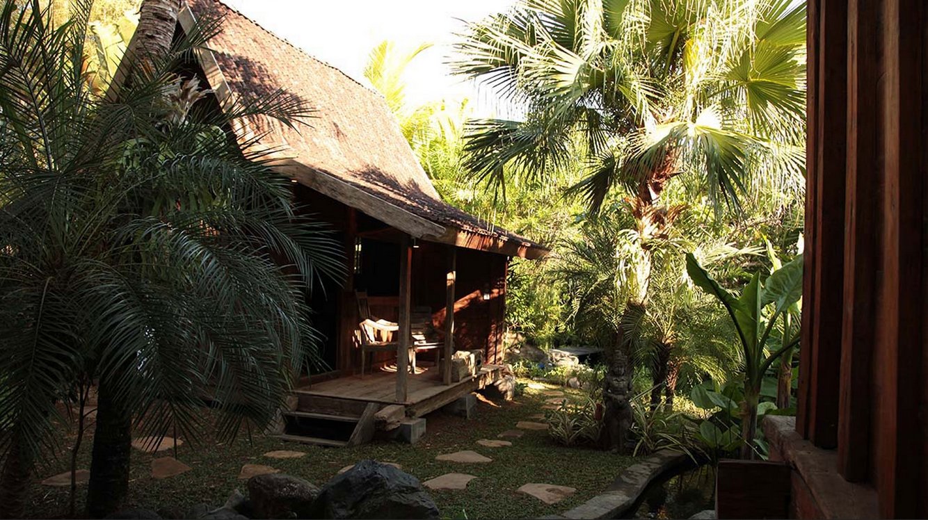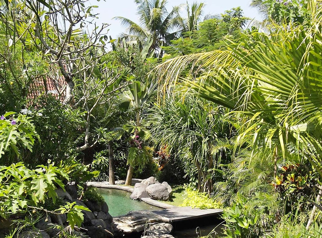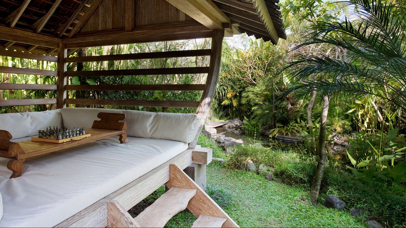 Doors lead to a small kitchenette on one side and a wardrobe and dressing area on the other; both the kitchenette and dressing room open onto a tropical garden bathroom. Across the pond is a second and much smaller gladak which serves as a reading or breakfast room, while across the swimming pool a relaxation balé beckons.