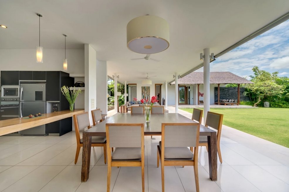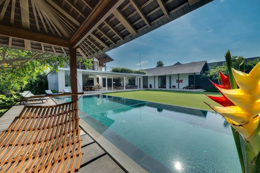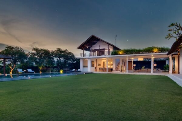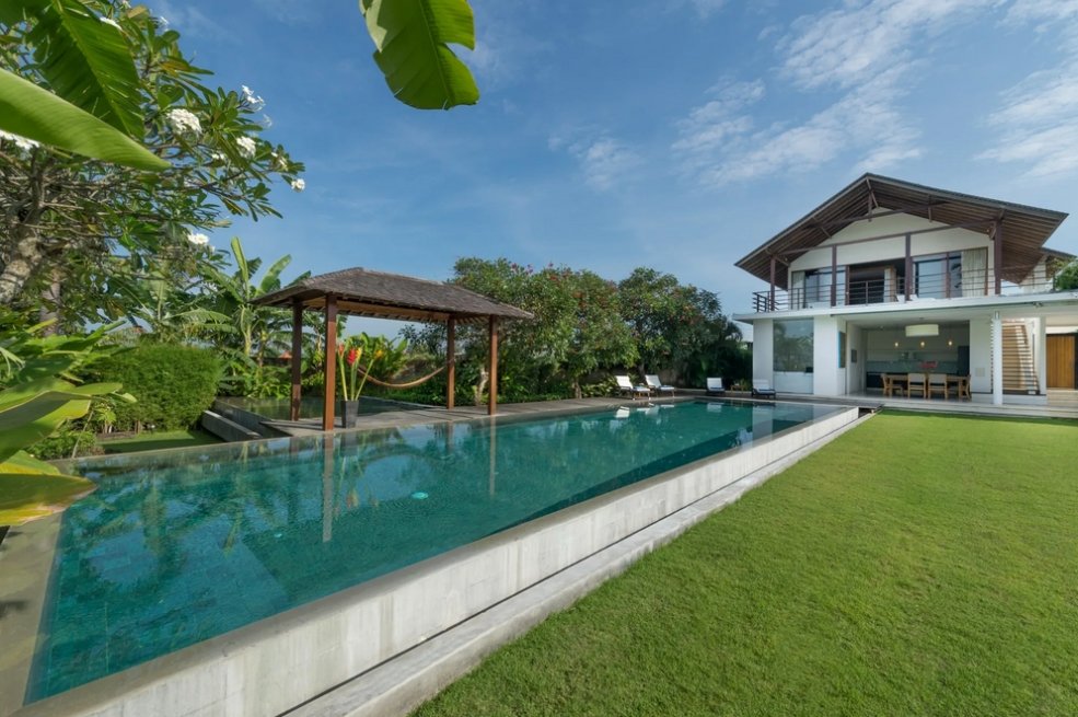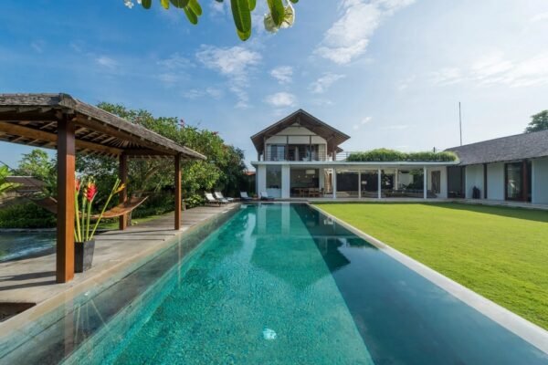 Beautiful 4-bedroom ensuite villa with modern interiors and expansive outdoor spaces, Features semi-open indoor living and dining areas that surround the lawn and pools, Great location with some of Canggu’s popular hotspots and beaches only a few steps away