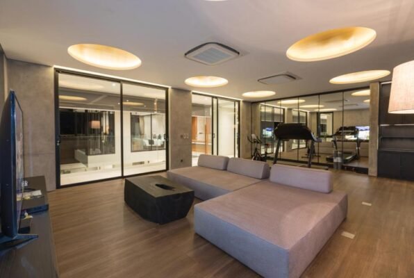 Villa features floor to ceiling glass windows designed with Electric curtains that open and close automatically only by the touch of a button that allow you to feel the nature and to protect you from the sunshine and lights.