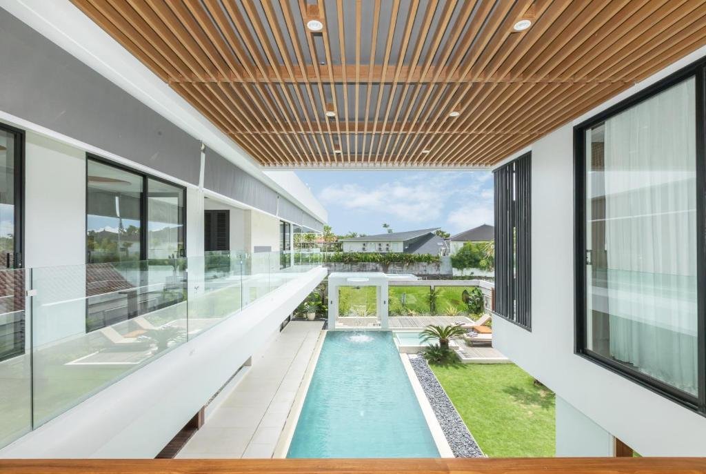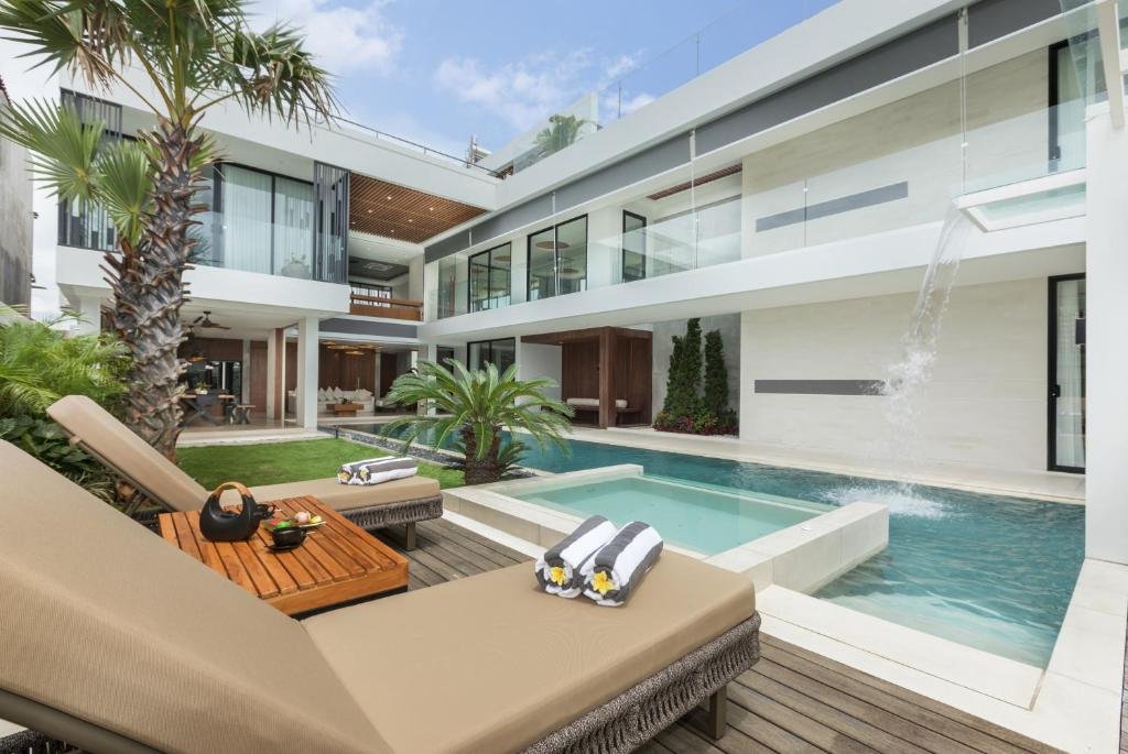 The 12-metres tropical swimming pool with pool bar overlooks a vertical garden bursting with tropical foliage β while a wide sun deck has built-in daybeds and deck chairs. To match its modern, upmarket ambiance each bathroom is designed in contemporary style with a wonderful bathtub and high-tech toilet adapted from Japan technology.
