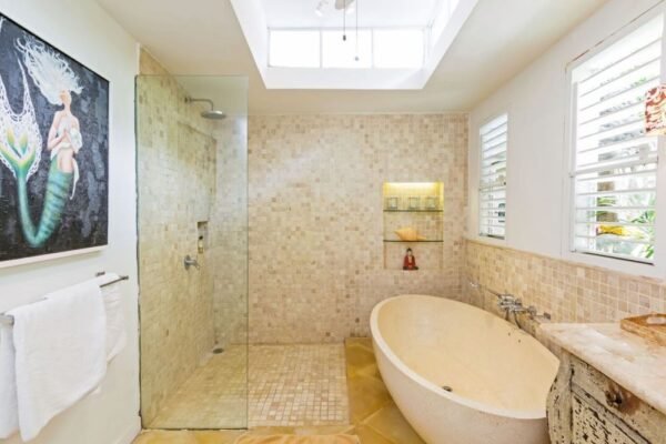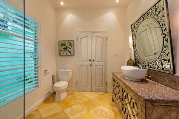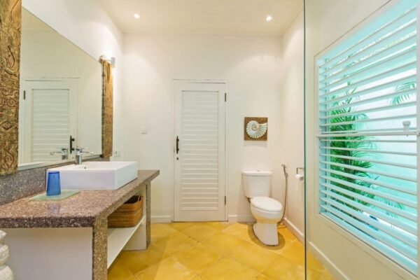 Surrounded by tropical greenery, the outdoor space invites you to relax, unwind, and fully embrace the island vibe. The pool is perfect for morning dips or afternoon lounging, and at night, the entire garden glows under the soft lighting, offering a magical setting for cocktails or quiet reflection.
