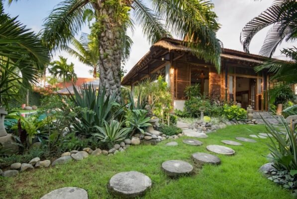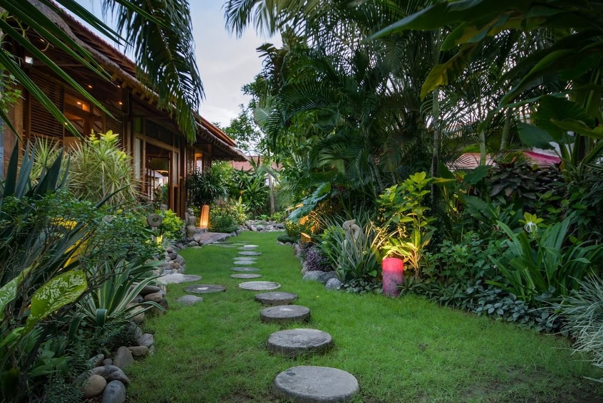 Behind the pool, you will discover the secret garden with abundant tropical foliage and a stone path leading up to the main living pavilion.