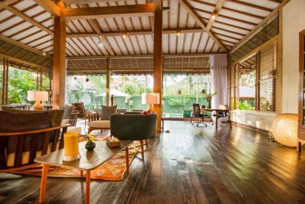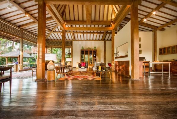 The stunning open-plan living area is right off the swimming pool and features a high-vaulted ceiling that is traditionally Balinese. The room is furnished with wooden armchairs, lounge chairs, tables, cushioned chairs and sofas.