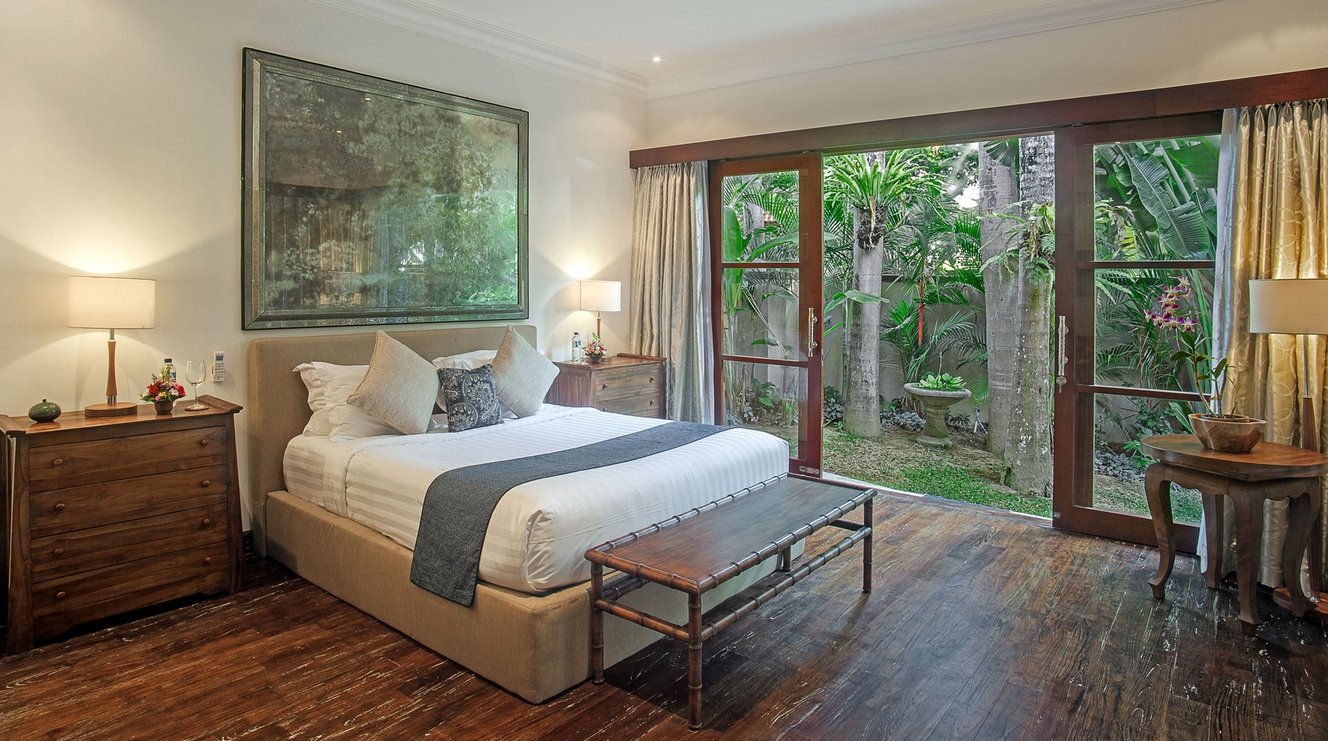 The villa provides the perfect sanctuary for a couple who value extra privacy. Accessed via a small lobby off the living room, the bedroom features a queen-size bed and small seating area facing the pool terrace beyond a wall of glass double doors.
