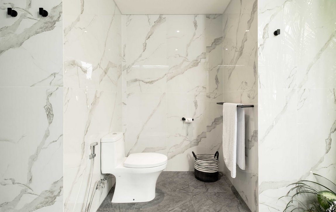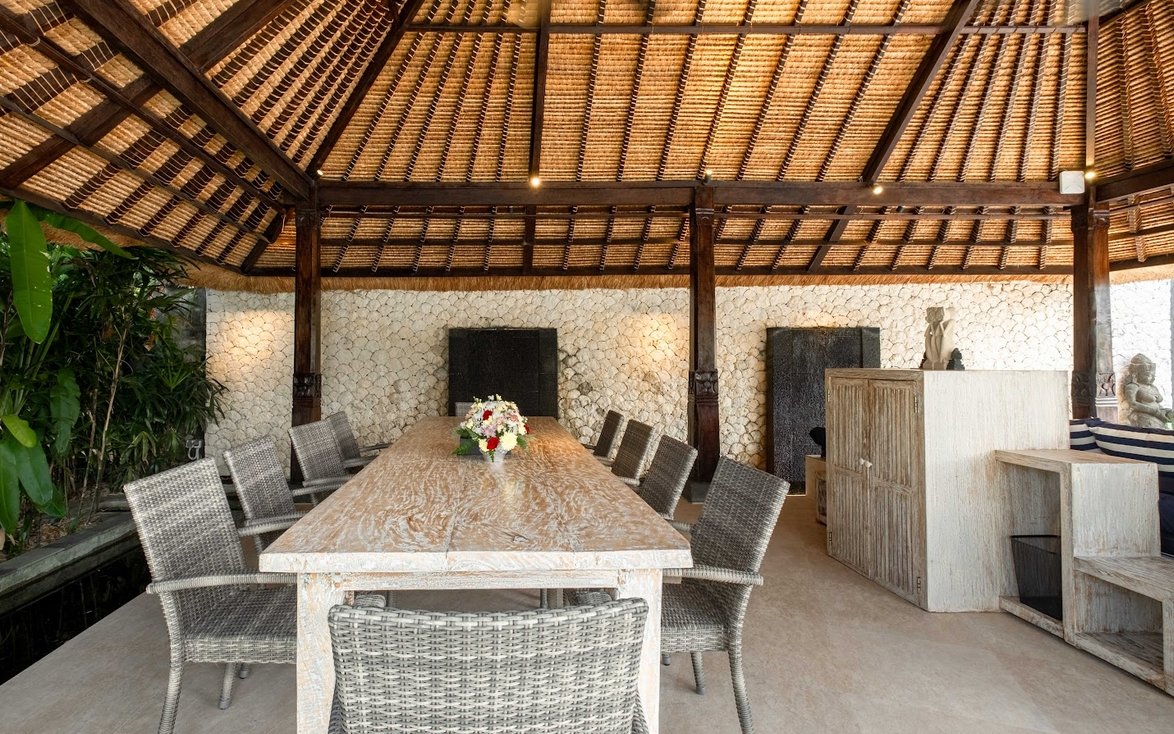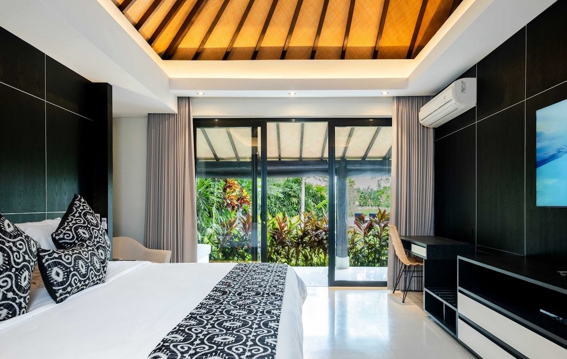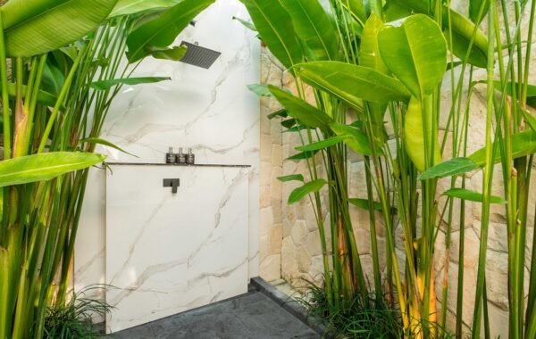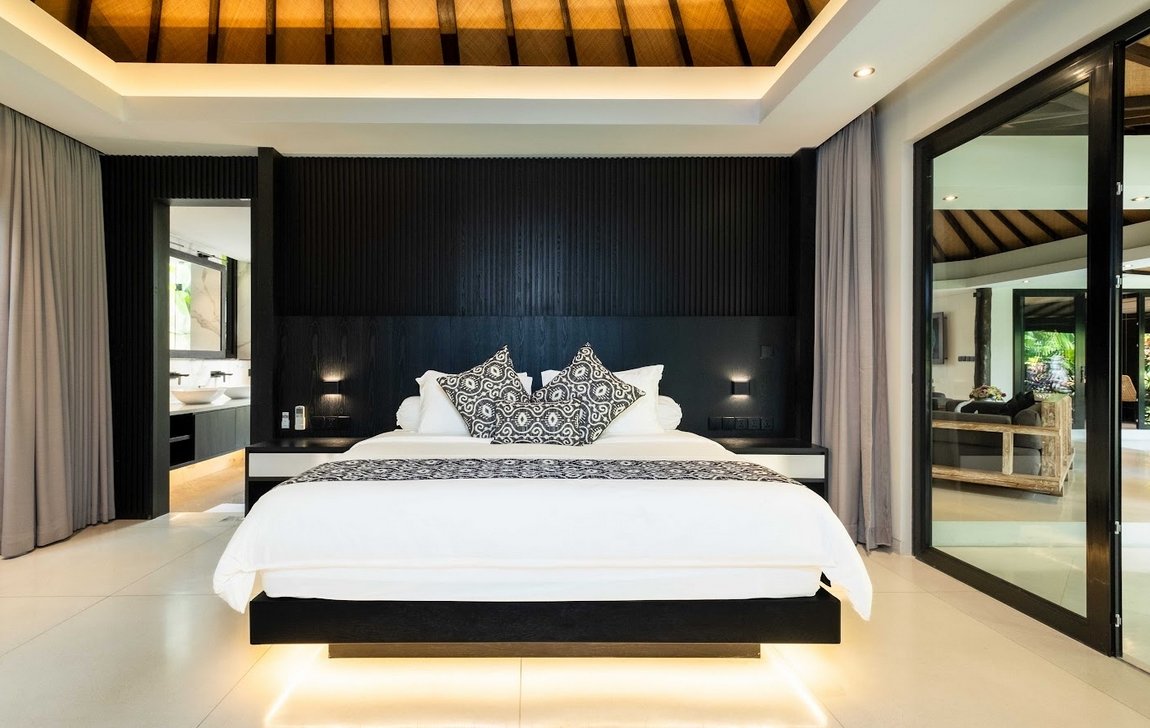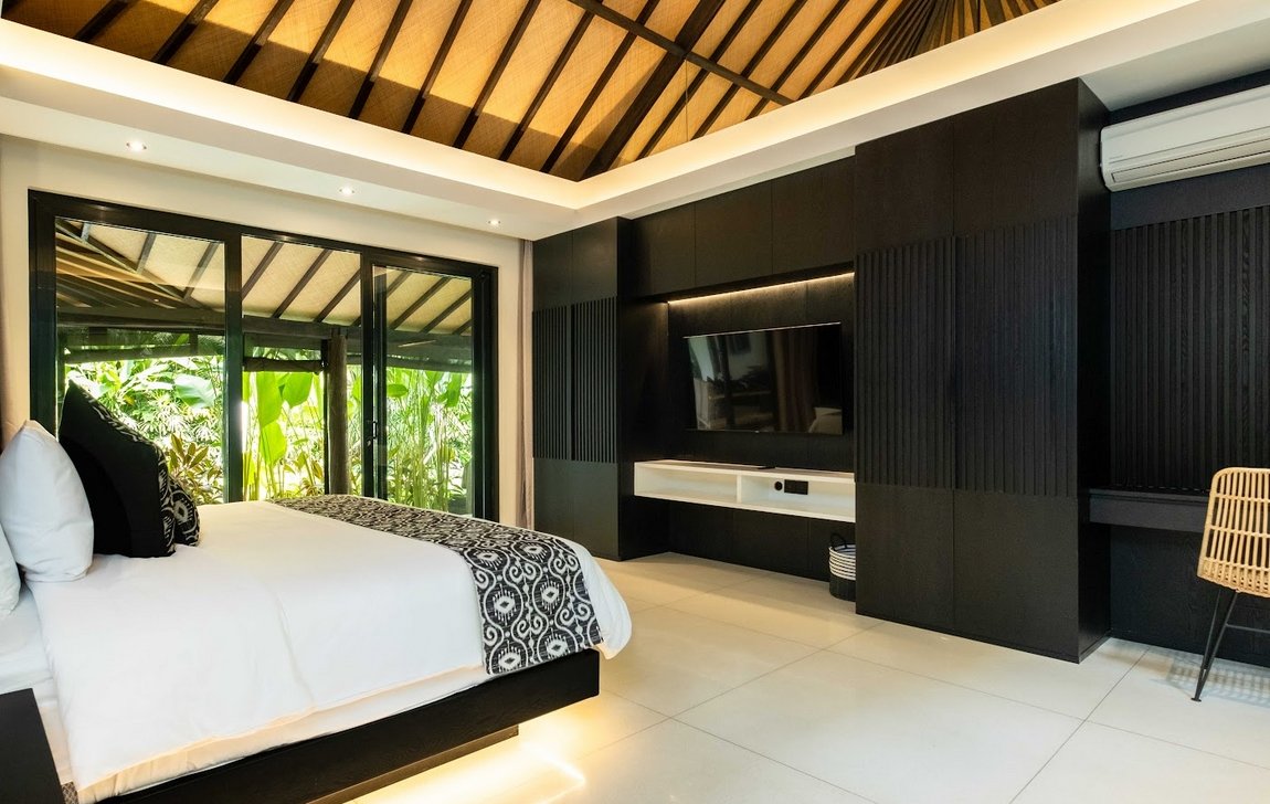 Five spacious bedrooms, each with king-size beds, air conditioning, and elegant décor, provide restful nights. The master suite overlooks the garden and pool, while bathrooms feature modern fixtures, outdoor showers, and two with soaking bathtubs — bringing a touch of luxury to every stay.