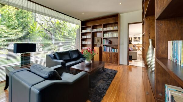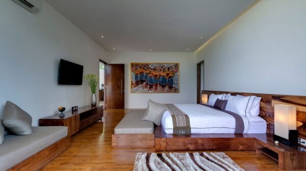 Perched high above Jimbaran Bay, this architect-designed villa blends traditional Balinese elegance with sleek modern design. Floor-to-ceiling glass panels invite sunlight and panoramic ocean views, while polished wood floors, serene water features, and an 18-meter infinity pool add a sense of indulgent calm.