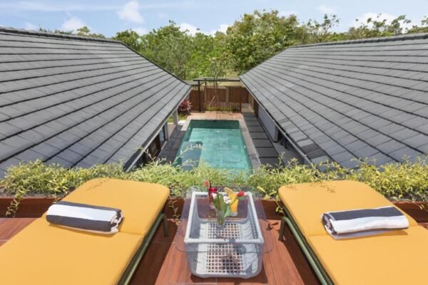 Featuring a private 12 x 5 meter swimming pool with a wooden pool deck, sun loungers, and a covered poolside daybed, the villa invites you to relax in style. The two luxurious bedrooms each have king-size beds, air conditioning, flat-screen TVs with international satellite channels, and in-room safes. Each bedroom includes an en suite bathroom with separate shower stalls and rainfall shower heads.