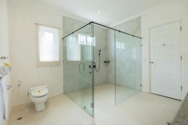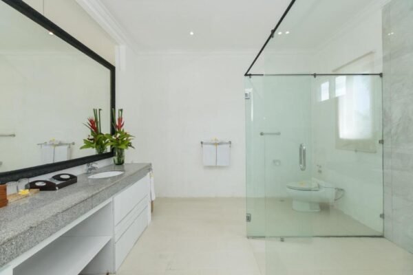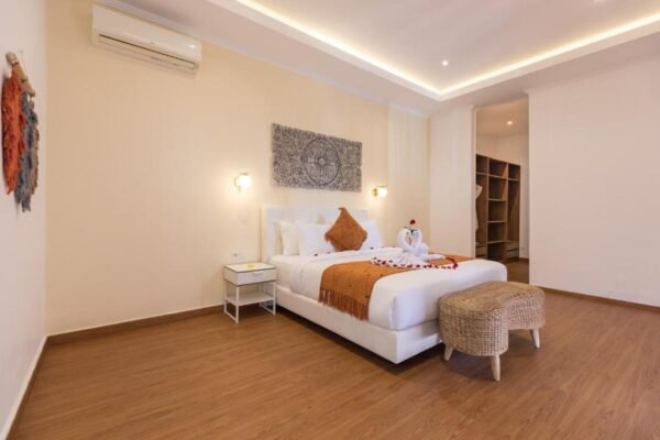 Each of the 5 bedrooms is thoughtfully designed with modern wooden furnishings, air conditioning, and its own private ensuite bathroom. The bathrooms feature sleek white interiors, stylish wash basins, and rain showers — providing both comfort and elegance.