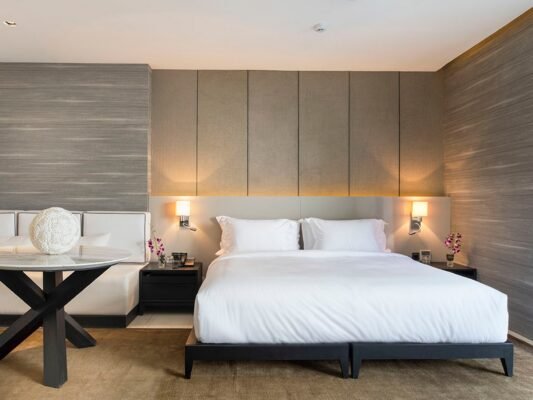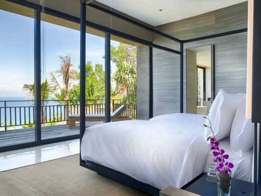 All 5 bedrooms are elegantly designed with custom furniture, soft ivory tones, ample wardrobes, and a choice of air-conditioning or fan. Bathrooms feature Javanese marble, rain showers, and bathtubs with serene views.