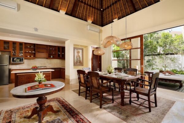 The high rattan ceiling in the living room brings an airy feel, while white sofas, elegant dΓ©cor, and premium finishes add to the villaβs effortless sophistication.
