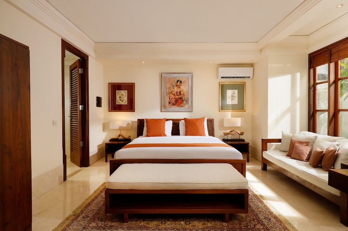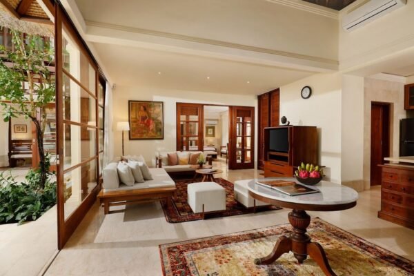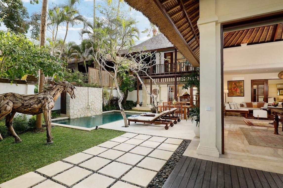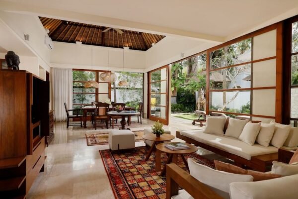 Walk through a grand limestone entrance and be greeted by a striking wooden horse sculptureβjust the beginning of this villa’s design charm. Inside, you’ll find wooden floors, antique art, and a thoughtful combination of natural stone and wood materials. Every detail blends Balinese tradition with subtle modern touches.