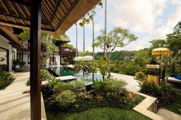 Tucked into the limestone hills of Jimbaran, this beautifully designed villa combines traditional Balinese charm with modern comforts. Three stand-alone pavilions frame a serene garden courtyard with a 12-meter swimming pool, lush greenery, and private outdoor lounge zones — all just a 5-minute stroll to the iconic Jimbaran Beach.