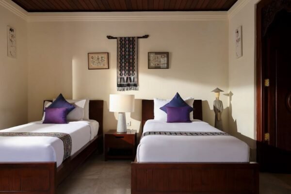 Tucked away in a serene gated villa estate in lush Jimbaran, this 3-bedroom tropical retreat blends Balinese charm with modern comforts. Just a 5-minute walk to the iconic Jimbaran Beach, itβs the perfect setting for a relaxing family vacation or an intimate island escape with friends.