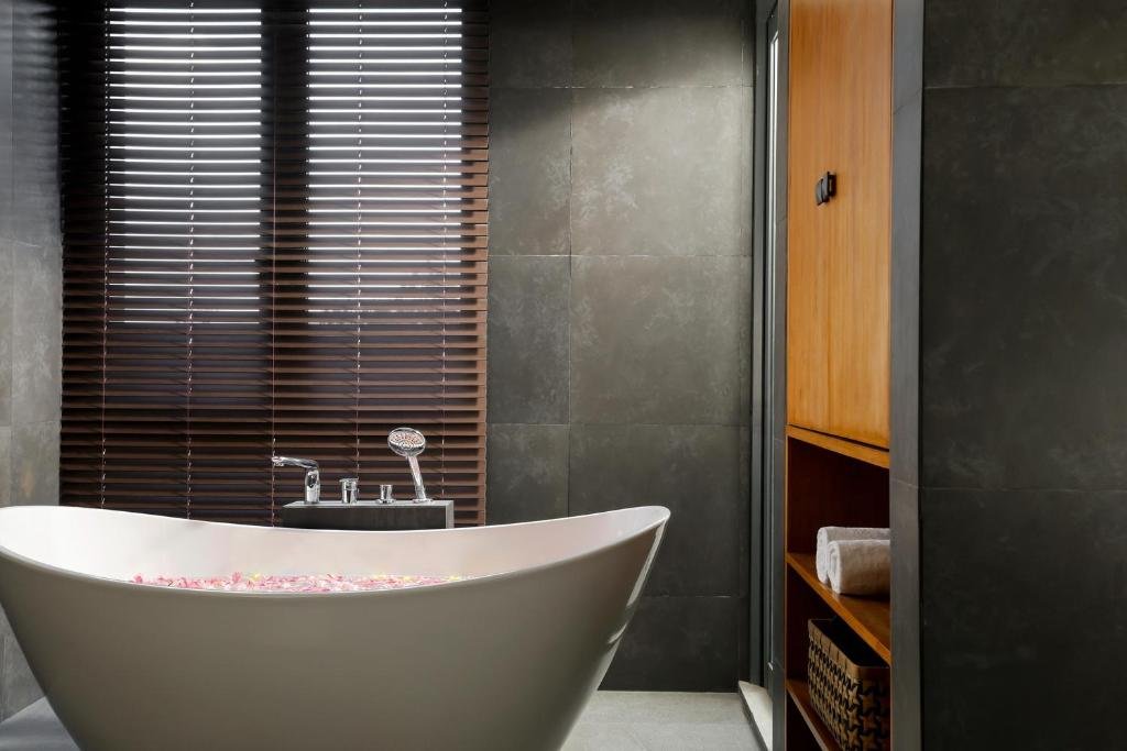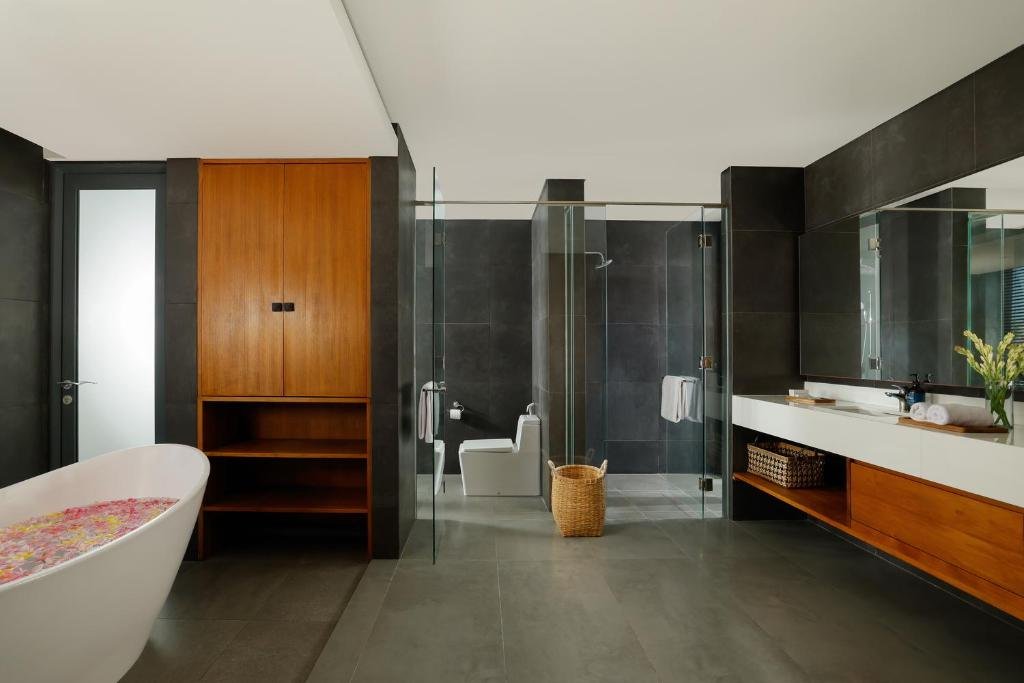 King bed, en-suite bathroom with single vanity and bathtub. Sea view.