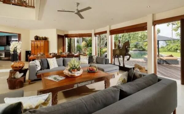 • Spacious open-plan living room with oversized sofas & Balinese antiques