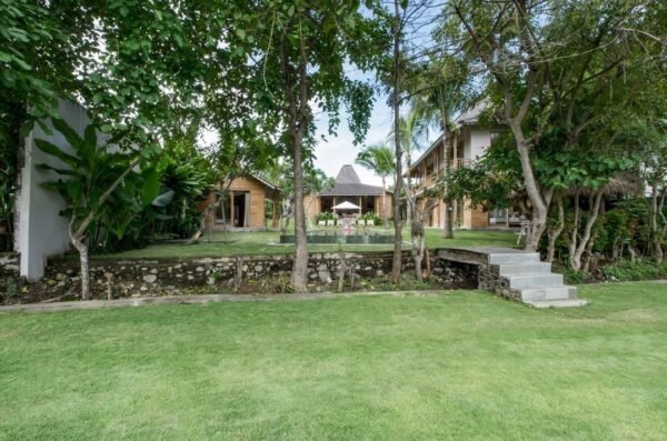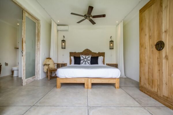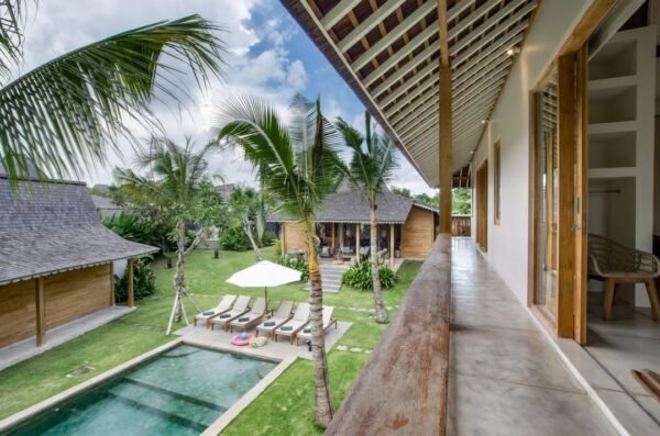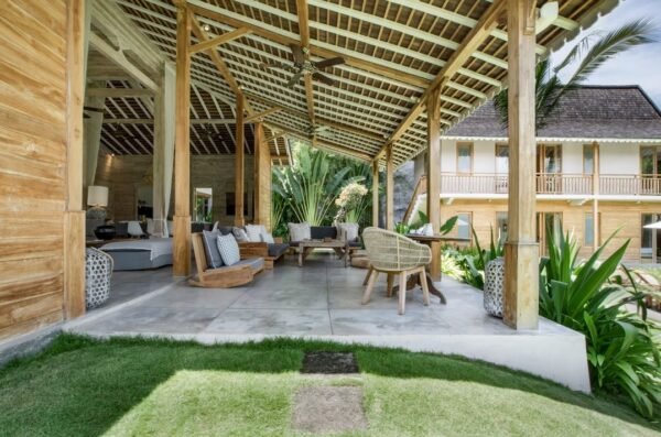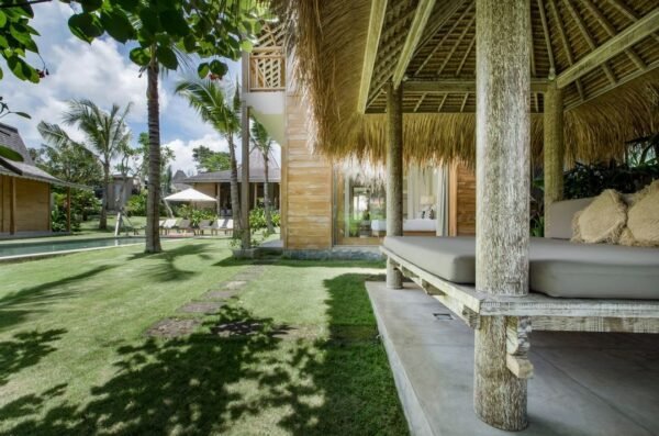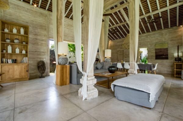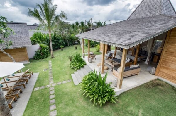 This villa is a cluster of about three pavilions which illustrate traditional Balinese architecture manifested by the unmistakable Joglo style roofs. Interiors are appointed with a fusion of weathered wood and stylish, contemporary furnishings.