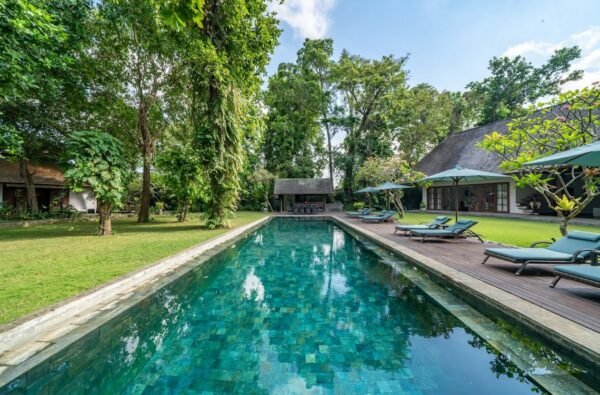 Set within 2,800 square meters of lush tropical grounds, this serene 7-bedroom private villa offers a harmonious blend of modern comforts and traditional Balinese elegance. Nestled in peaceful Kerobokan, just minutes away from the vibrant energy of Canggu and Seminyak, this villa is perfect for large families, retreats, or special celebrations.
