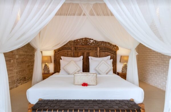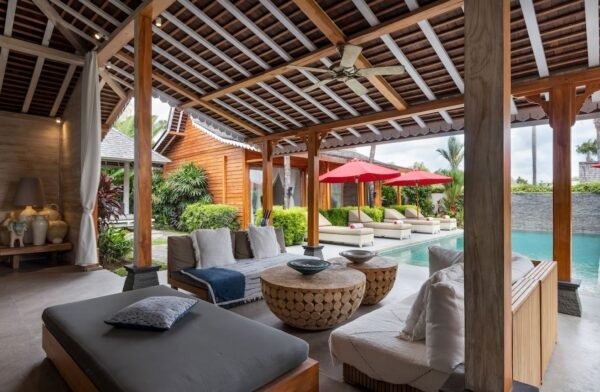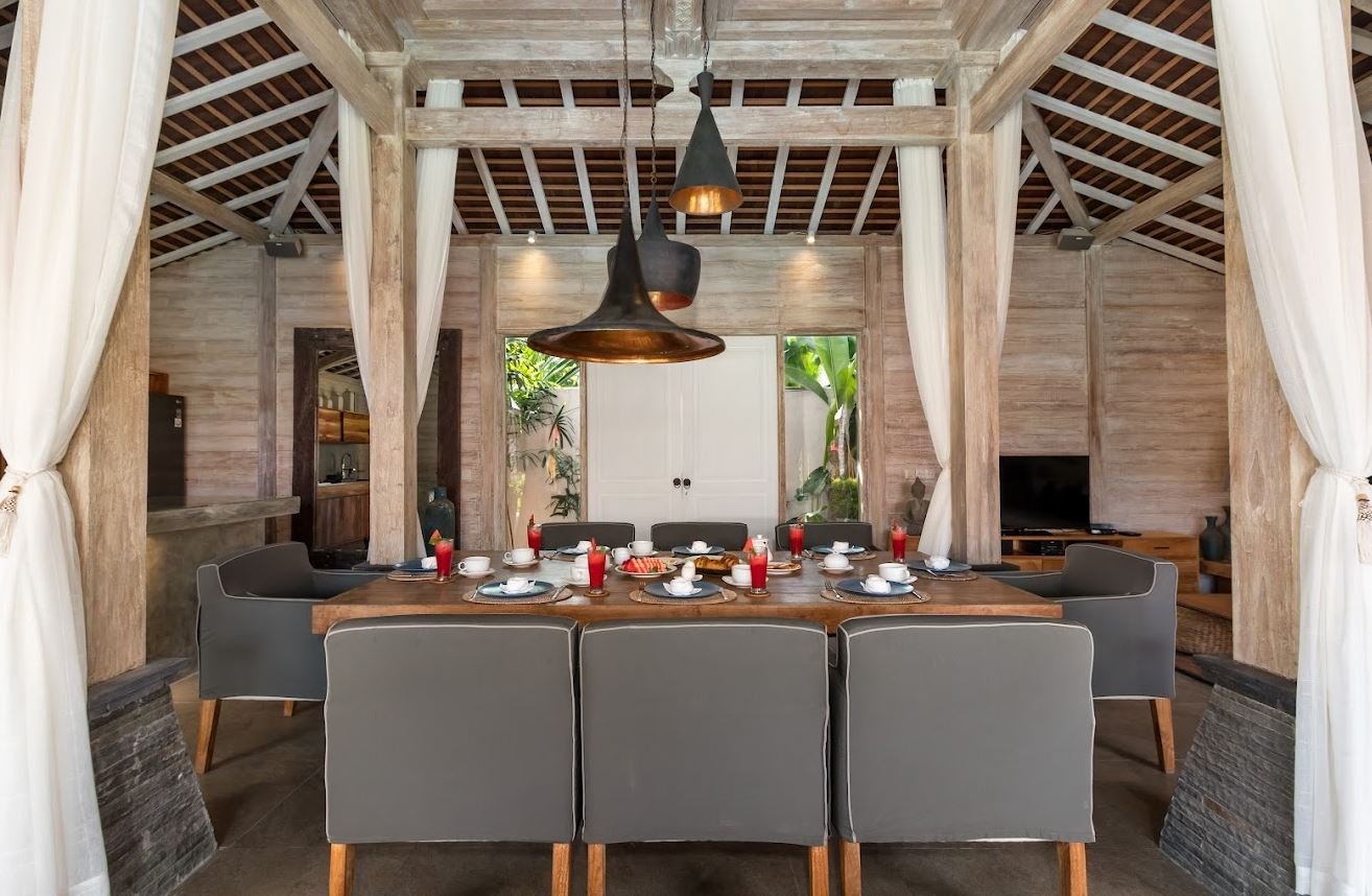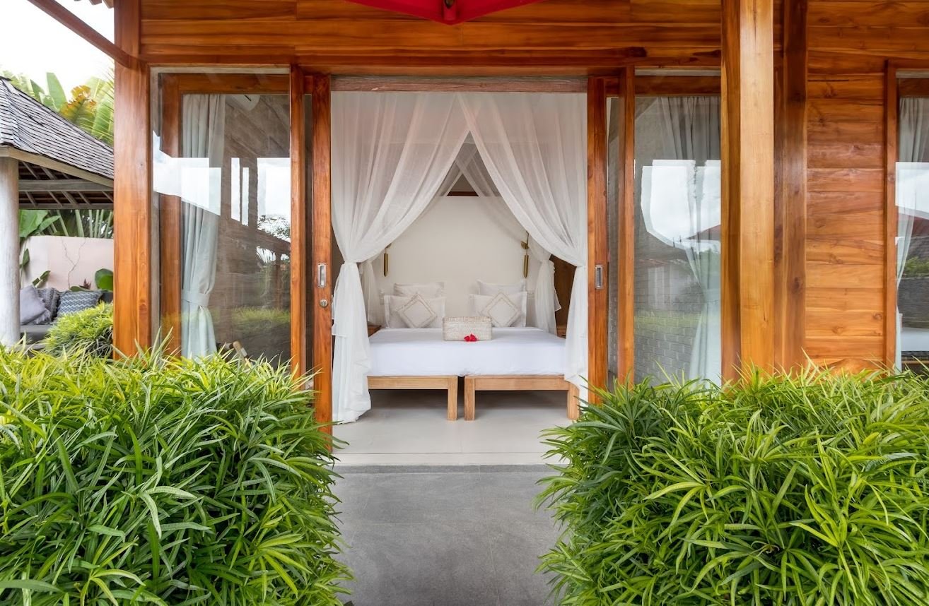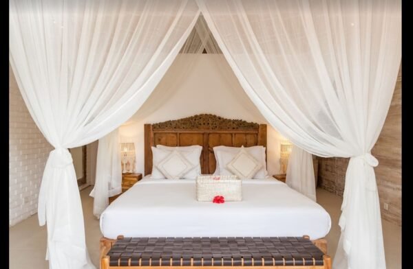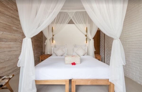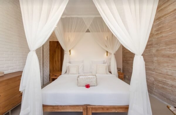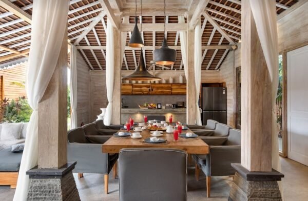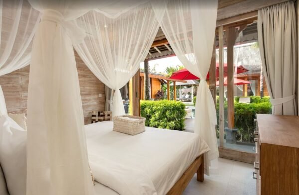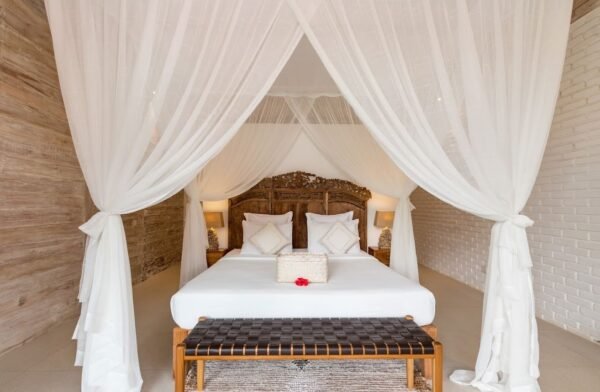 The villa has four bedrooms – housed in two separate pavilions on both sides of the swimming pool. Two of these bedrooms have draped king-sized beds while the other two bedrooms have draped twin beds that are joined together. All bedrooms also have dedicated bathrooms with rain showers.
