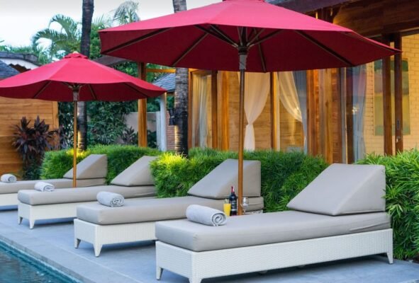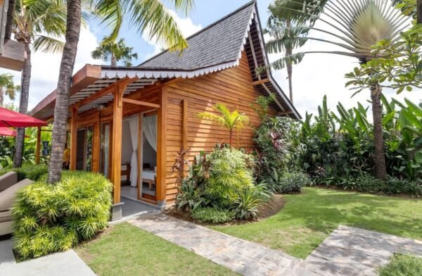 For a tan, lounge on cushioned, wooden pool beds on the sunny stone decks. But once the sunlight begins to burn, you may prefer to stretch out on the soft and wide mattress under the shade of the bale partially hidden on one side of the garden’s well-maintained lawn.