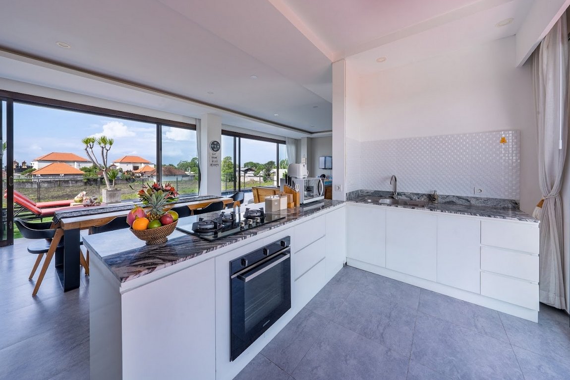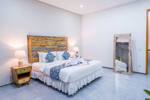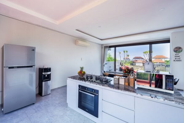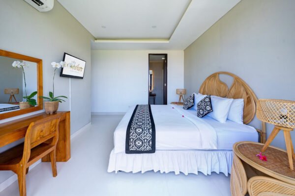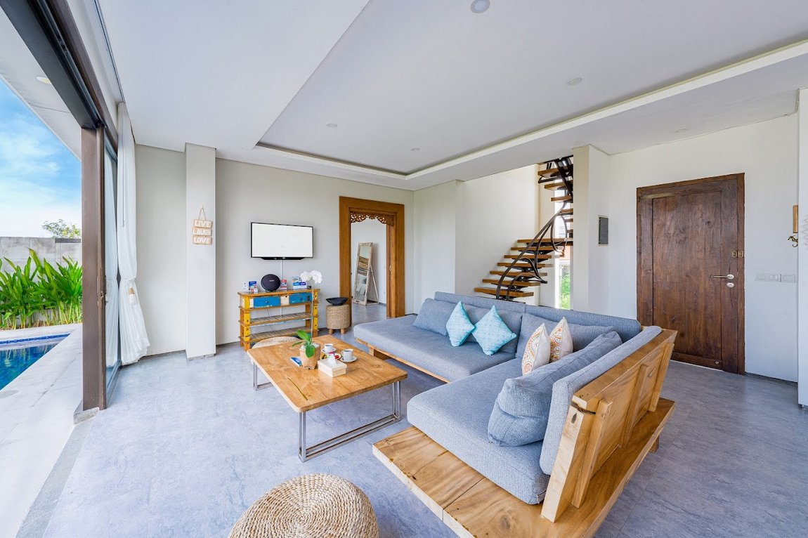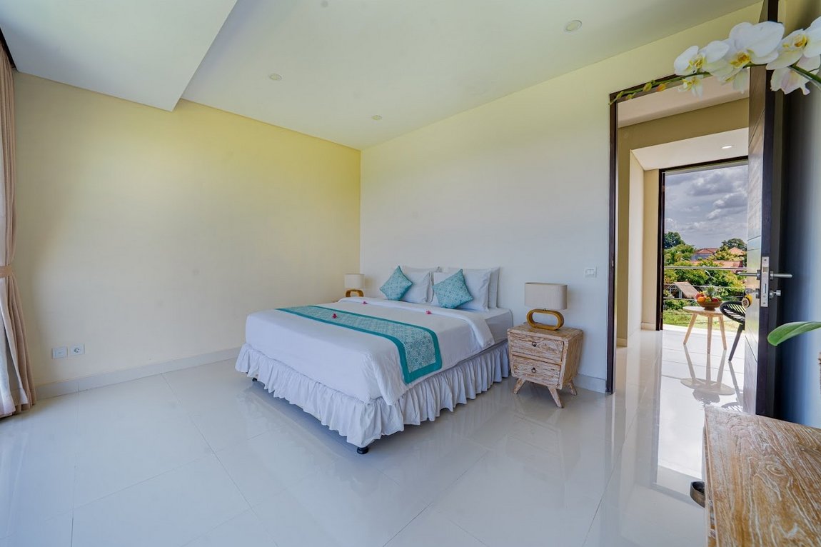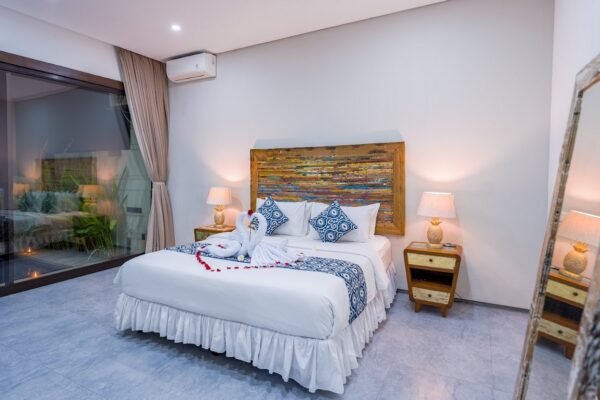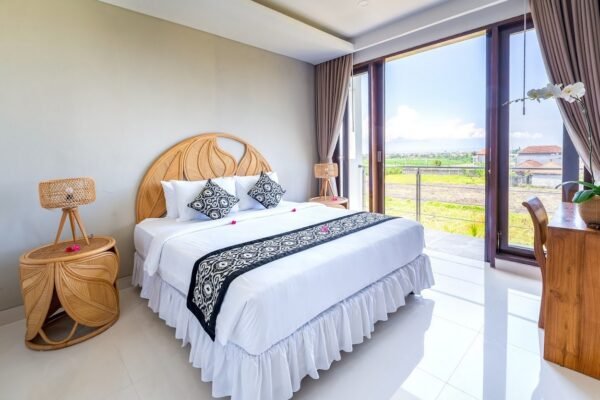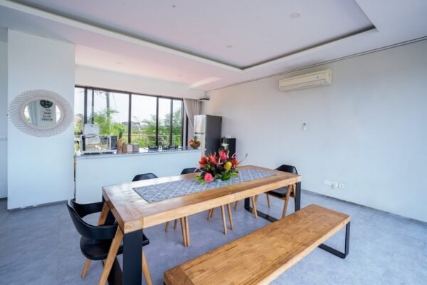 The villa’s design celebrates harmony with nature. Large windows and sliding glass doors bring the outdoors in, filling the space with natural light and fresh breezes. Every detail has been thoughtfully curated, combining modern comfort with warm touches of local artistry. The result is a home that feels luxurious yet unpretentious, designed to help you slow down and soak in Bali’s charm.