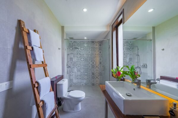 Four spacious bedrooms are spread across the villa, each featuring king-size beds with premium linens, air conditioning, and en-suite bathrooms. The master suite comes with a solid stone bathtub and garden views, creating a serene spa-like retreat. Each room is a blend of contemporary style and tropical warmth, ensuring restful nights after days of exploring.