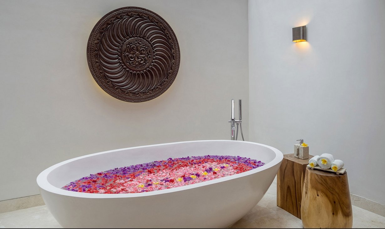 This is a perfect villa to share with friends or family for a blissful Bali break. The five bedroom suites are equally sumptuous – all have ensuite bathrooms and four have king beds. Three of these bedrooms have either bathtubs or jacuzzi tubs overlooking the ocean waves, while the fifth bedroom suite is twin-bedded and has direct access to the pool deck where our cliff-edge infinity pool merges with the turquoise sea.