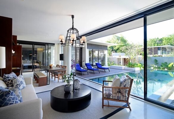 Soaked in natural sunlight, the villa features floor-to-ceiling glass walls that open directly from every room onto the central pool area. This seamless transition brings the outdoors in, offering serene views and easy access to the refreshing outdoor pool.