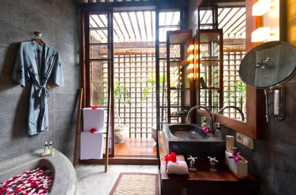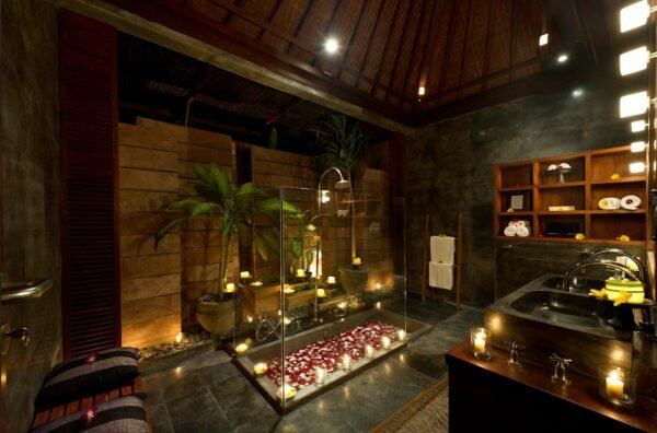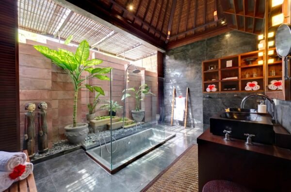 - Semi-open-air bathrooms with sunken tubs, rain showers, and tropical plants
