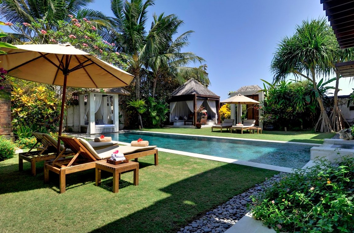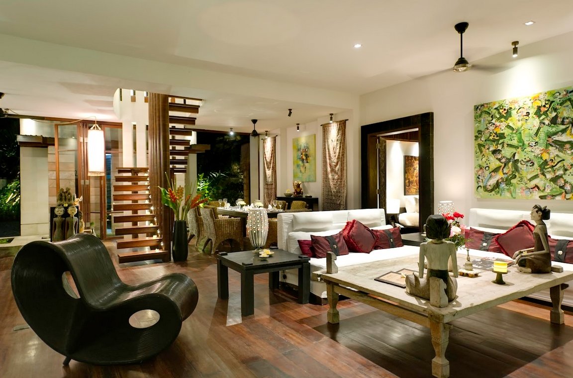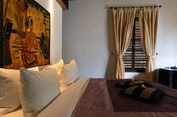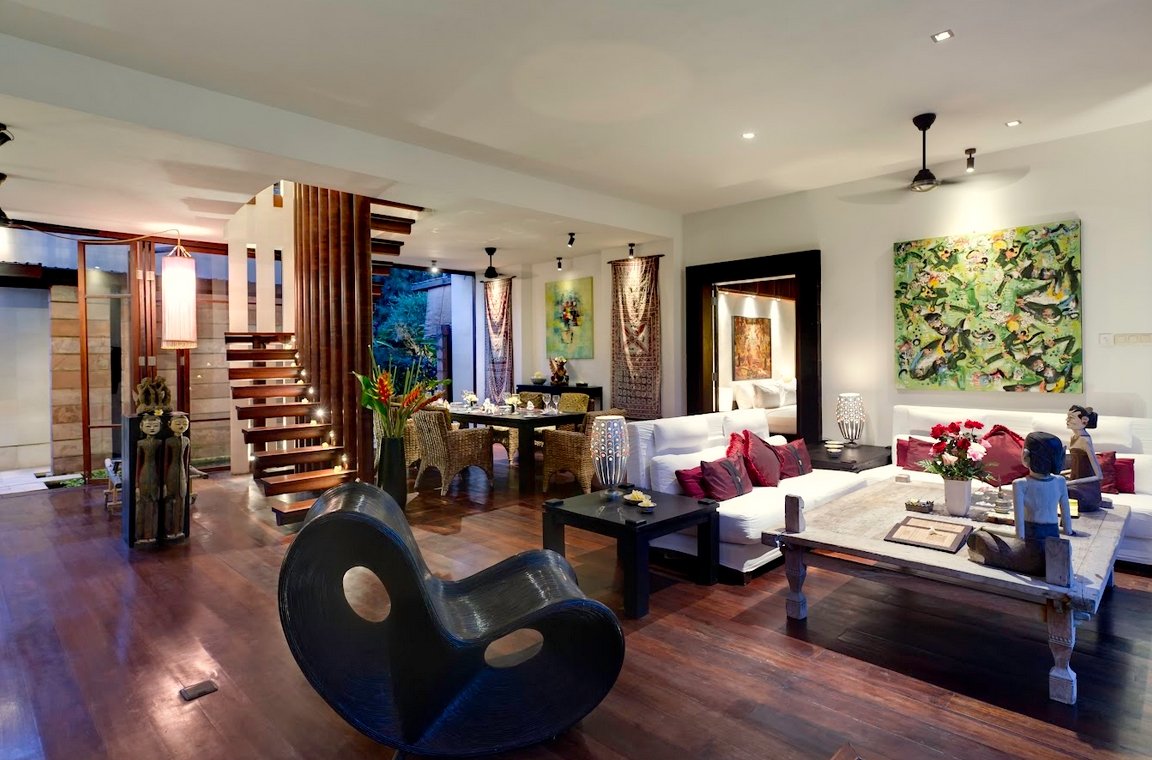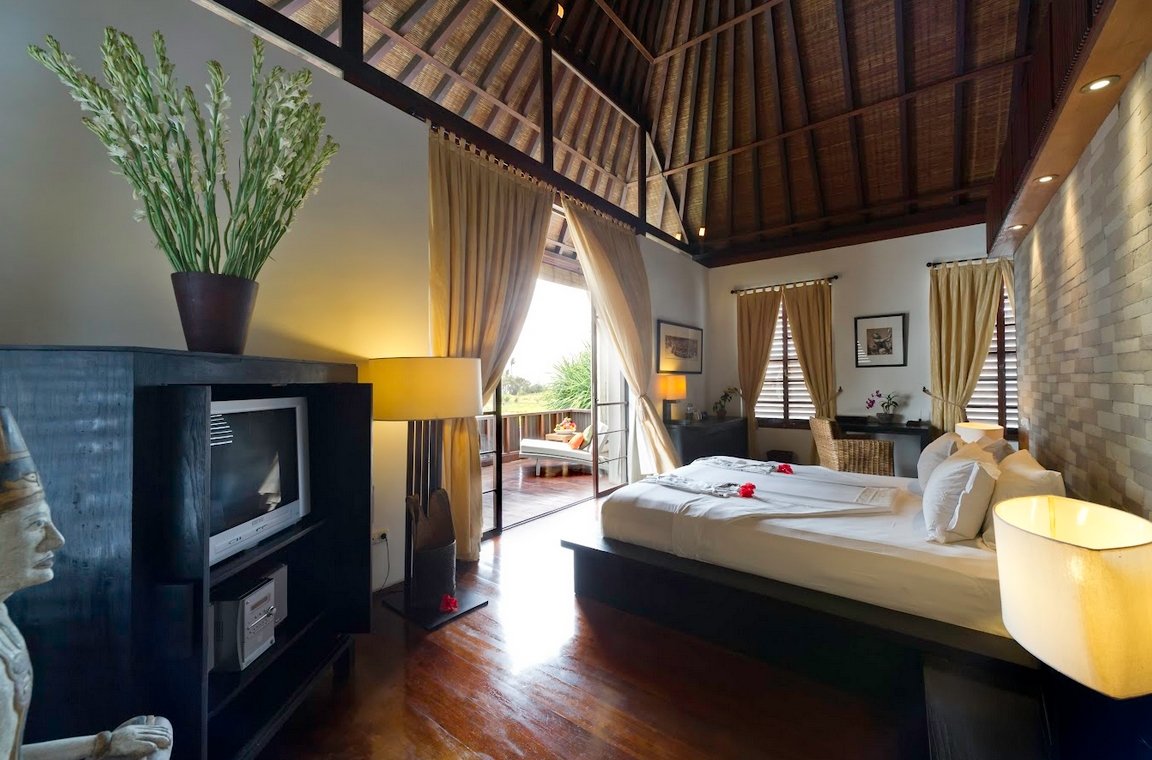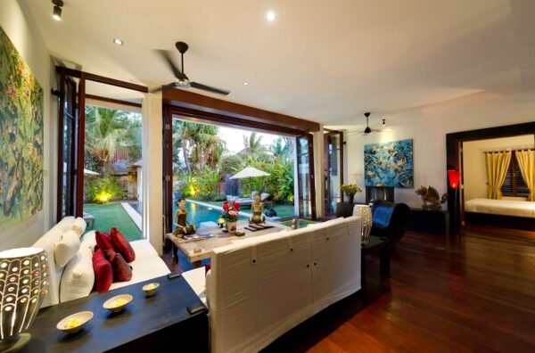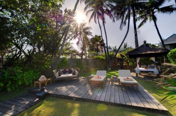 - Access via ornately carved Balinese doors or sliding garden doors