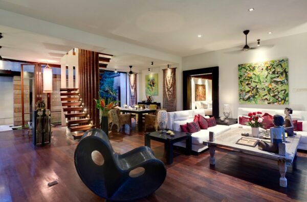 - Art, antique carvings, and a spiral staircase to the master suite