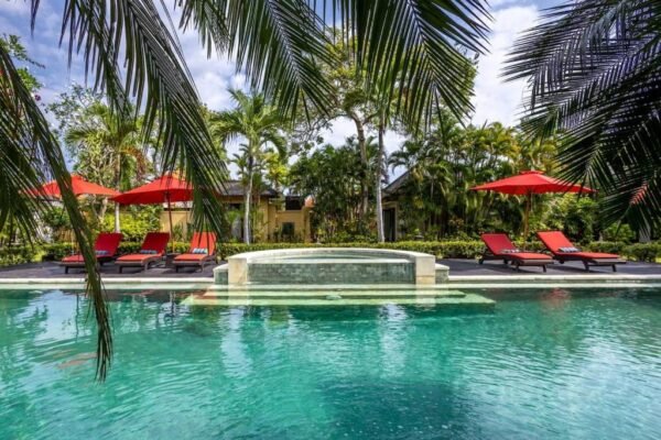 - Surrounded by lush palm trees, frangipanis & bougainvillea