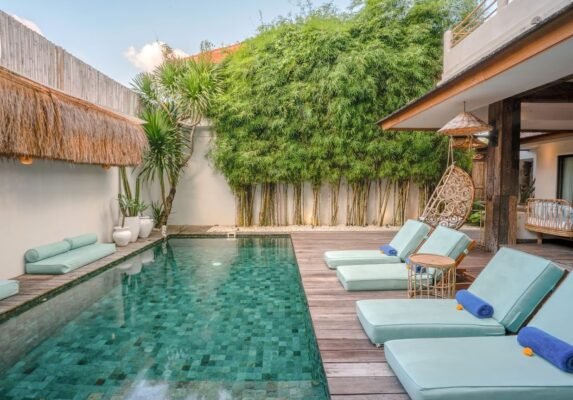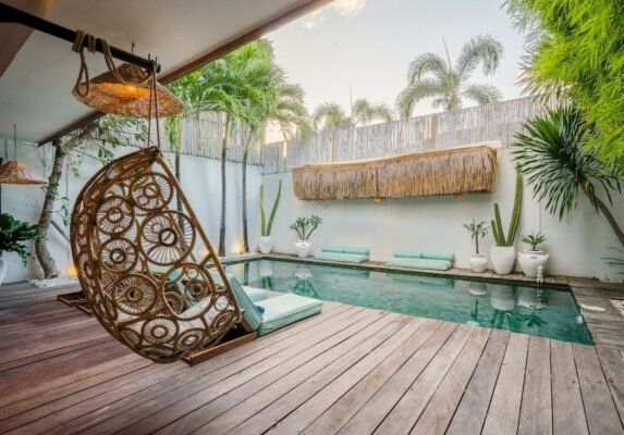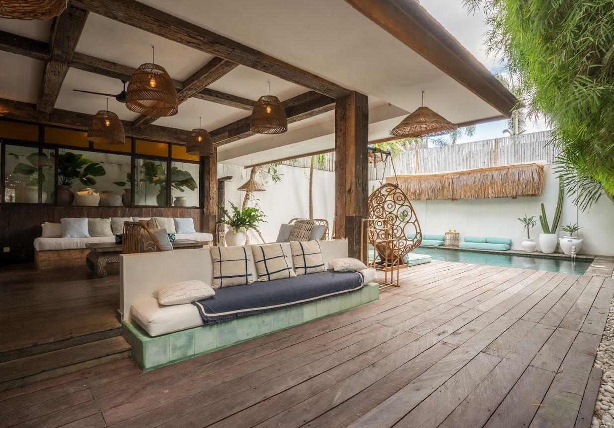 The pool is encompassed by a timber deck where you can soak up the sun on a bamboo daybed or curl up in the hanging chair with a good book to read. You can even enjoy an outdoor shower after swimming in the pool – really refreshing!
