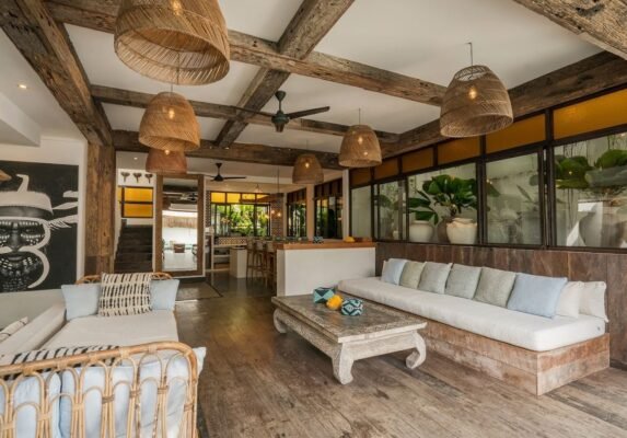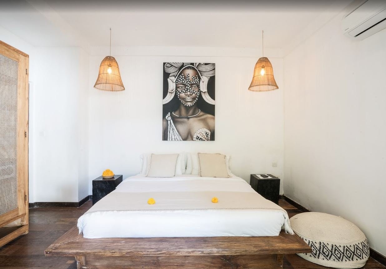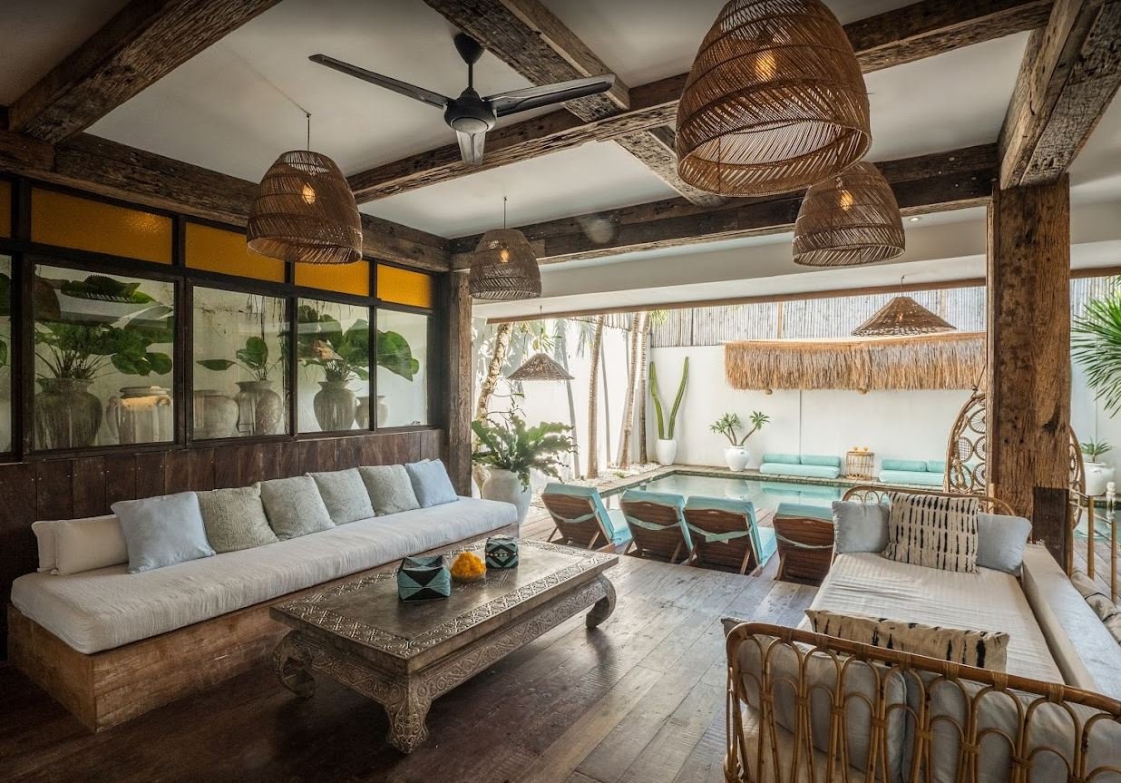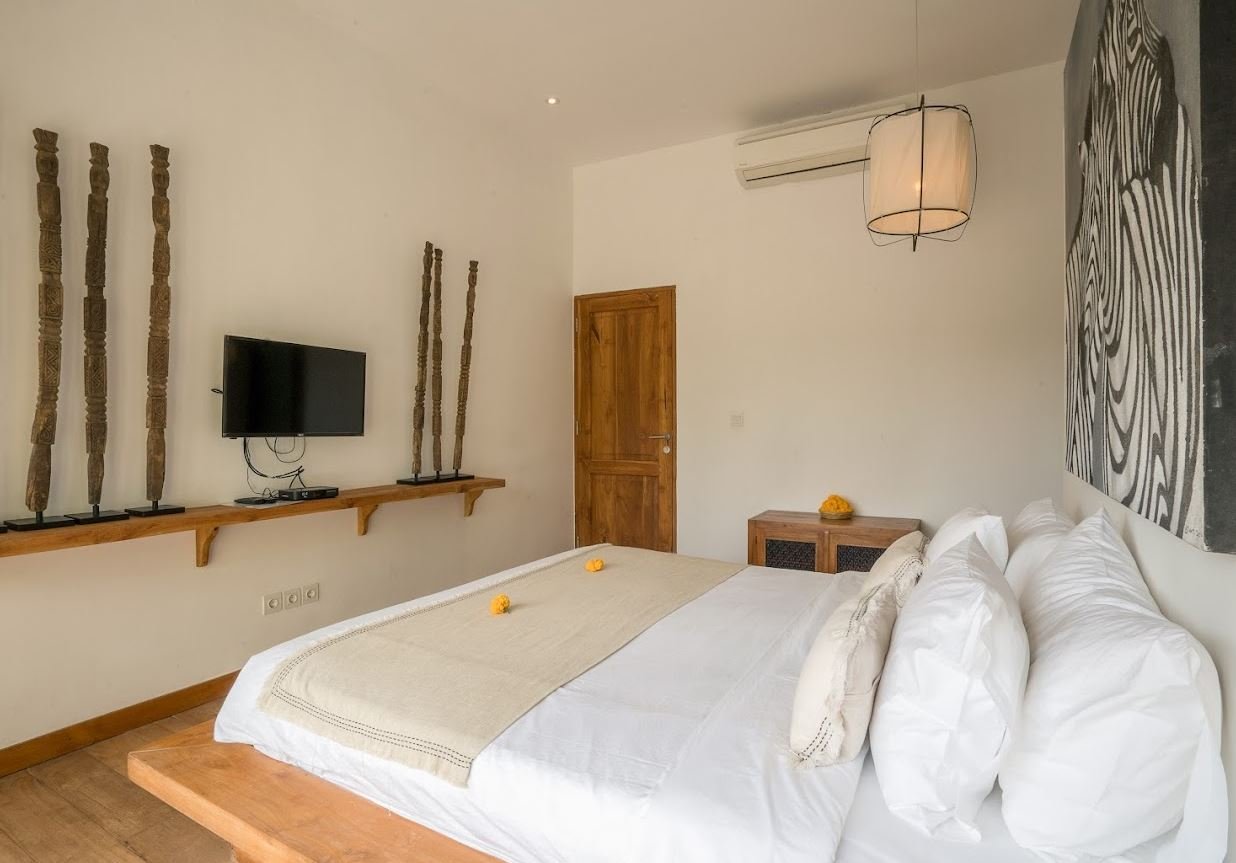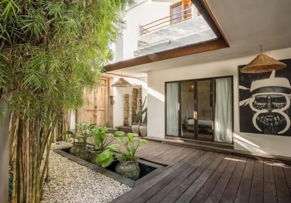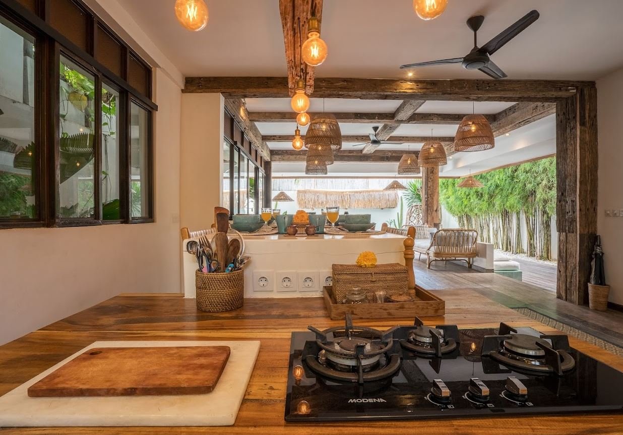 Villa has a generous private parking space in the front. Rustic timber doors lead inside the villa, welcoming you in its beautiful, peaceful Β garden Β with Β bamboo, Β palms, Β ponds, Β cactuses Β and Β tribal Β wooden-carved Β figures.