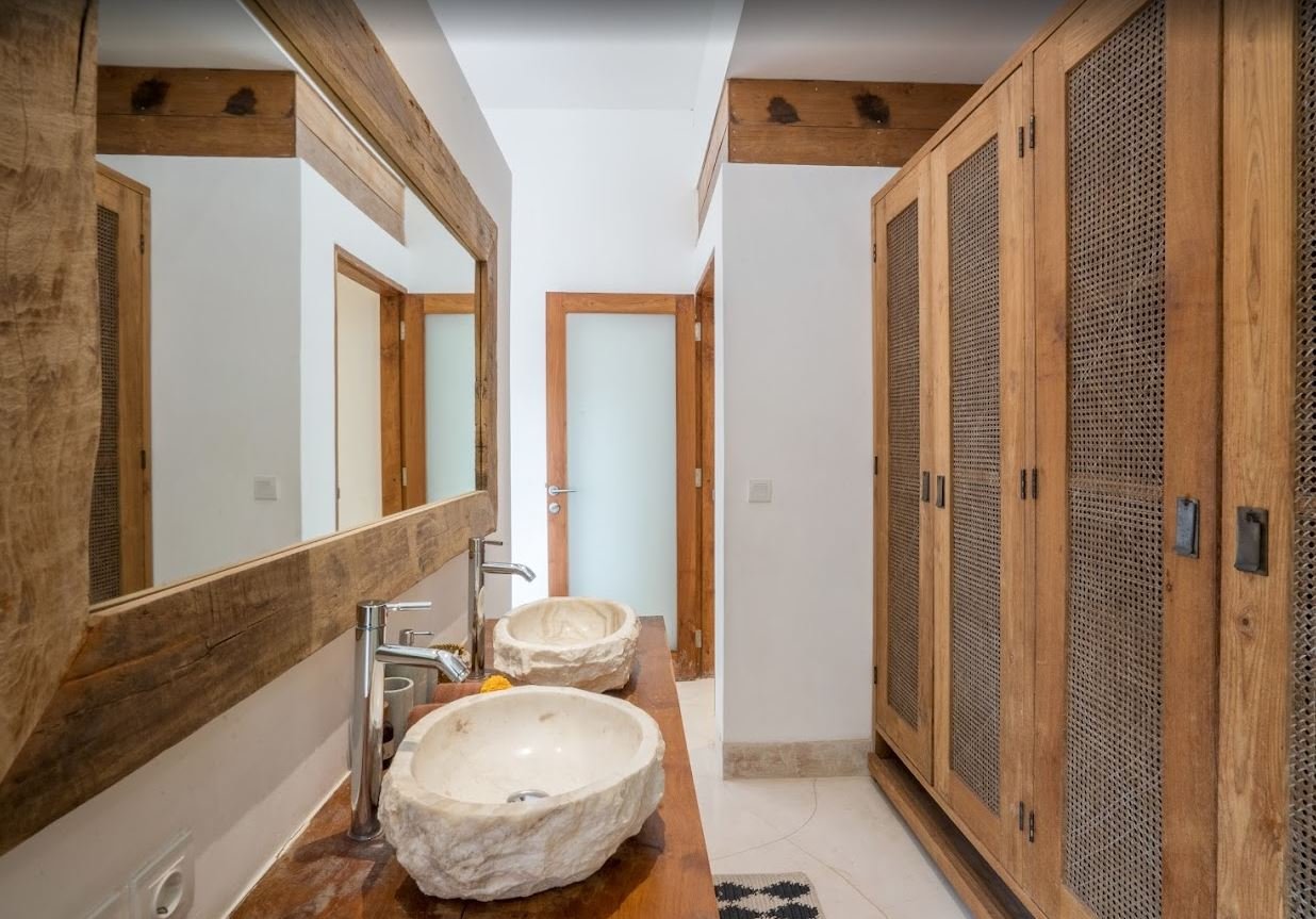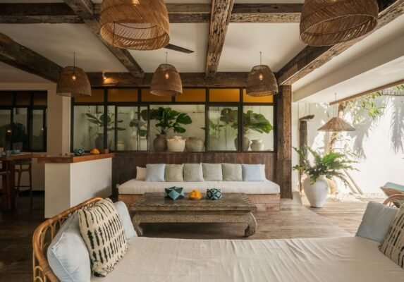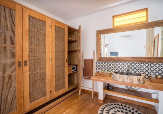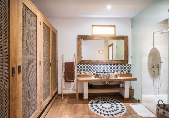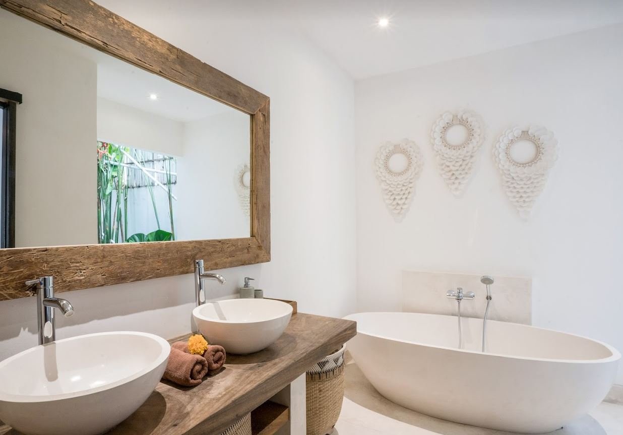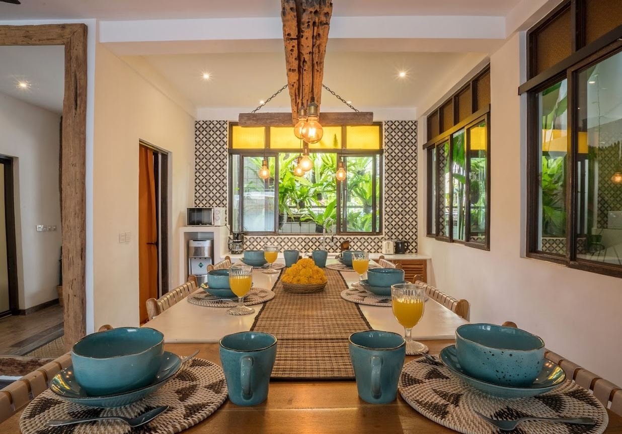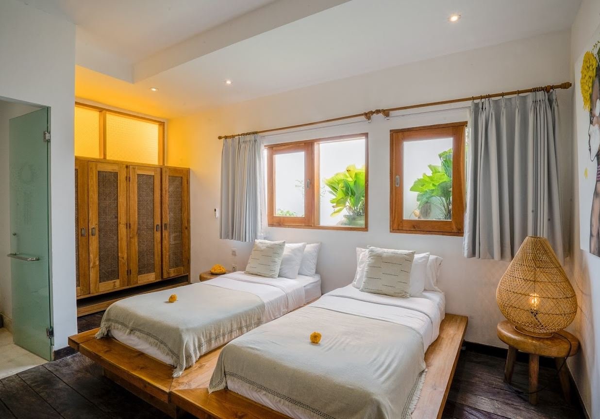 Villa has a generous private parking space in the front. Rustic timber doors lead inside the villa, welcoming you in its beautiful, peaceful Β garden Β with Β bamboo, Β palms, Β ponds, Β cactuses Β and Β tribal Β wooden-carved Β figures.