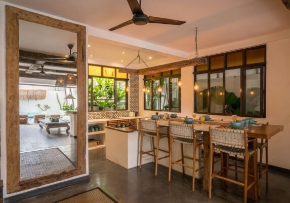 There is a sofa with a wooden-carved coffee table, a long bar with high chairs that doubles as a dining table and a modern open kitchen with hand-painted tiles.