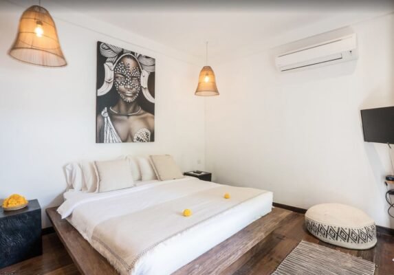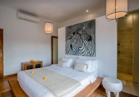 The villa houses 4 bedrooms. When coming down the stairs, turn right to gain access to the master bedroom – a large air-conditioned villa suite fitted with a king-size bed, a satellite-TV, wardrobes and a private en-suite bathroom with a bathtub, rain shower, and a separate toilet.