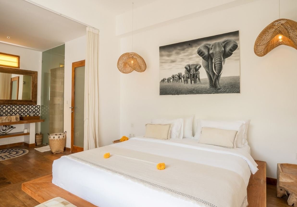 On the ground level of this double-storey luxury villa, just one step up from the villaβs garden sits the open-concept living room. This modern, lofty living space is designed elegantly with carefully-selected handmade wooden and rattan furniture, lamps and plants.