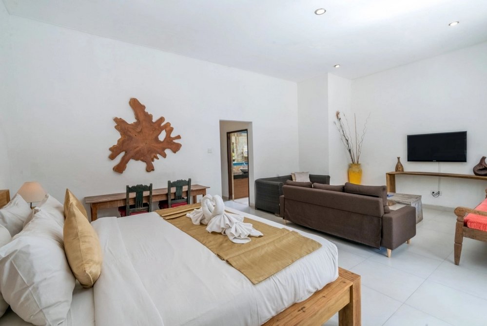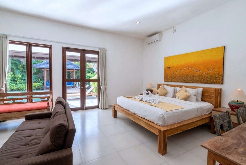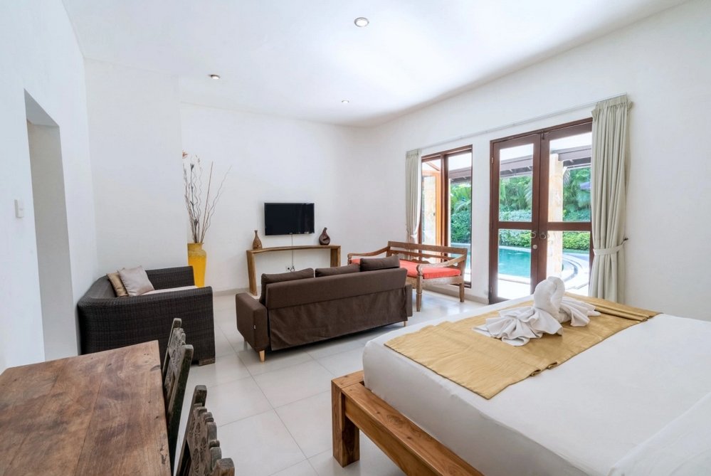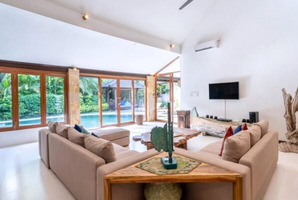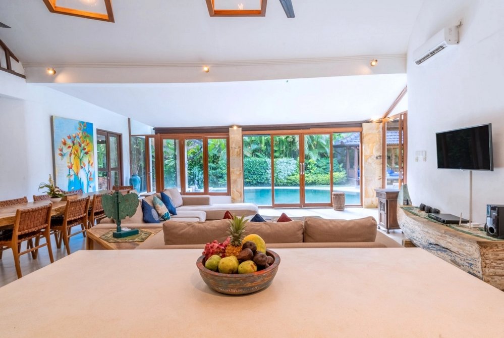 The villa features a fully enclosed and air-conditioned living area, facing the swimming pool and lush garden. Enjoy relaxing on comfortable sofas while watching your favorite shows on the flat-screen TV or streaming music through the sound system.