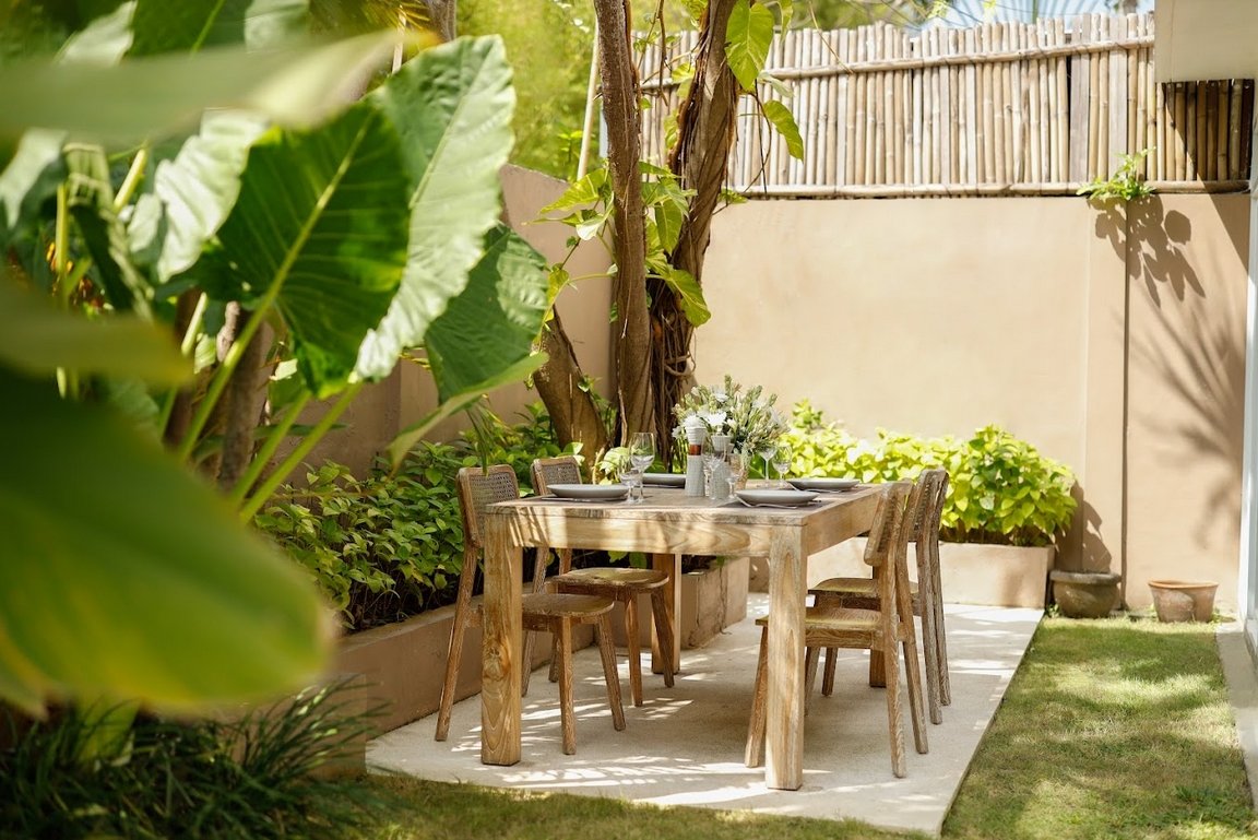 • 🌿 A lush courtyard garden surrounds the sparkling outdoor pool, creating a secluded retreat for guests.