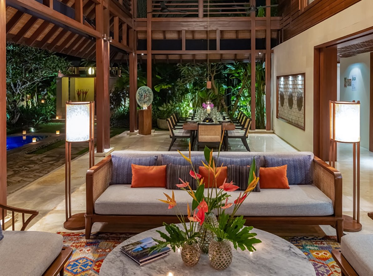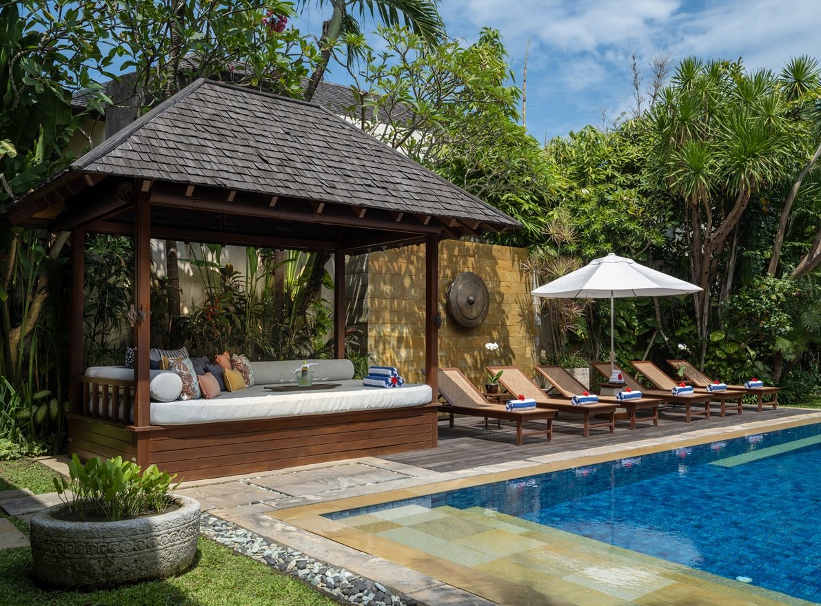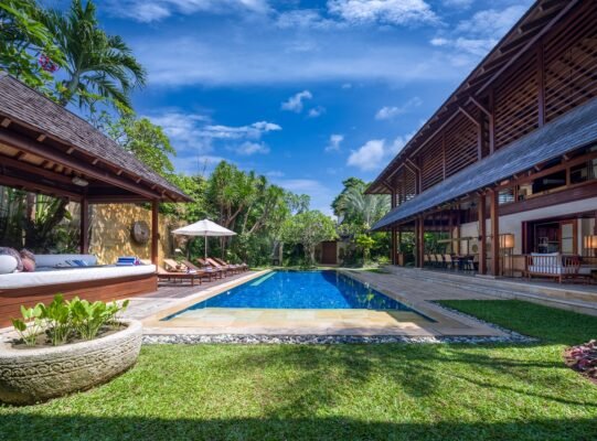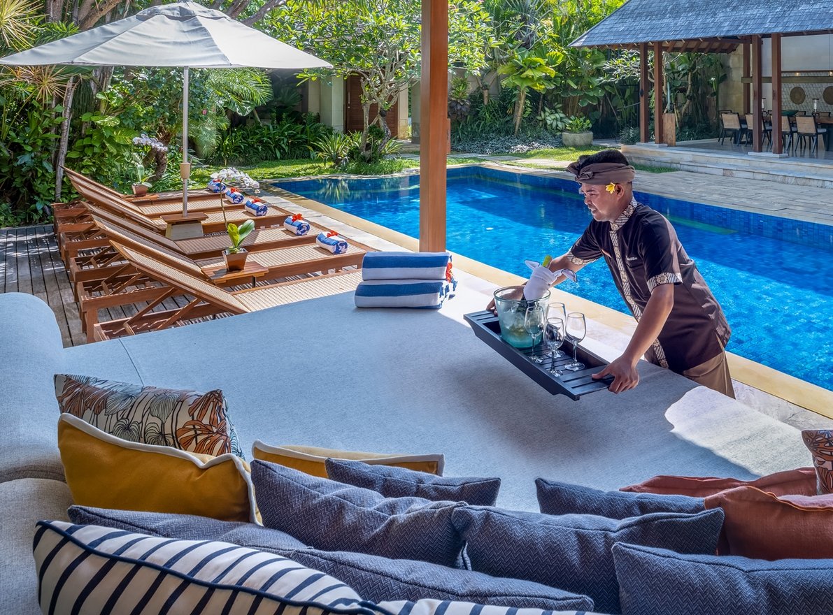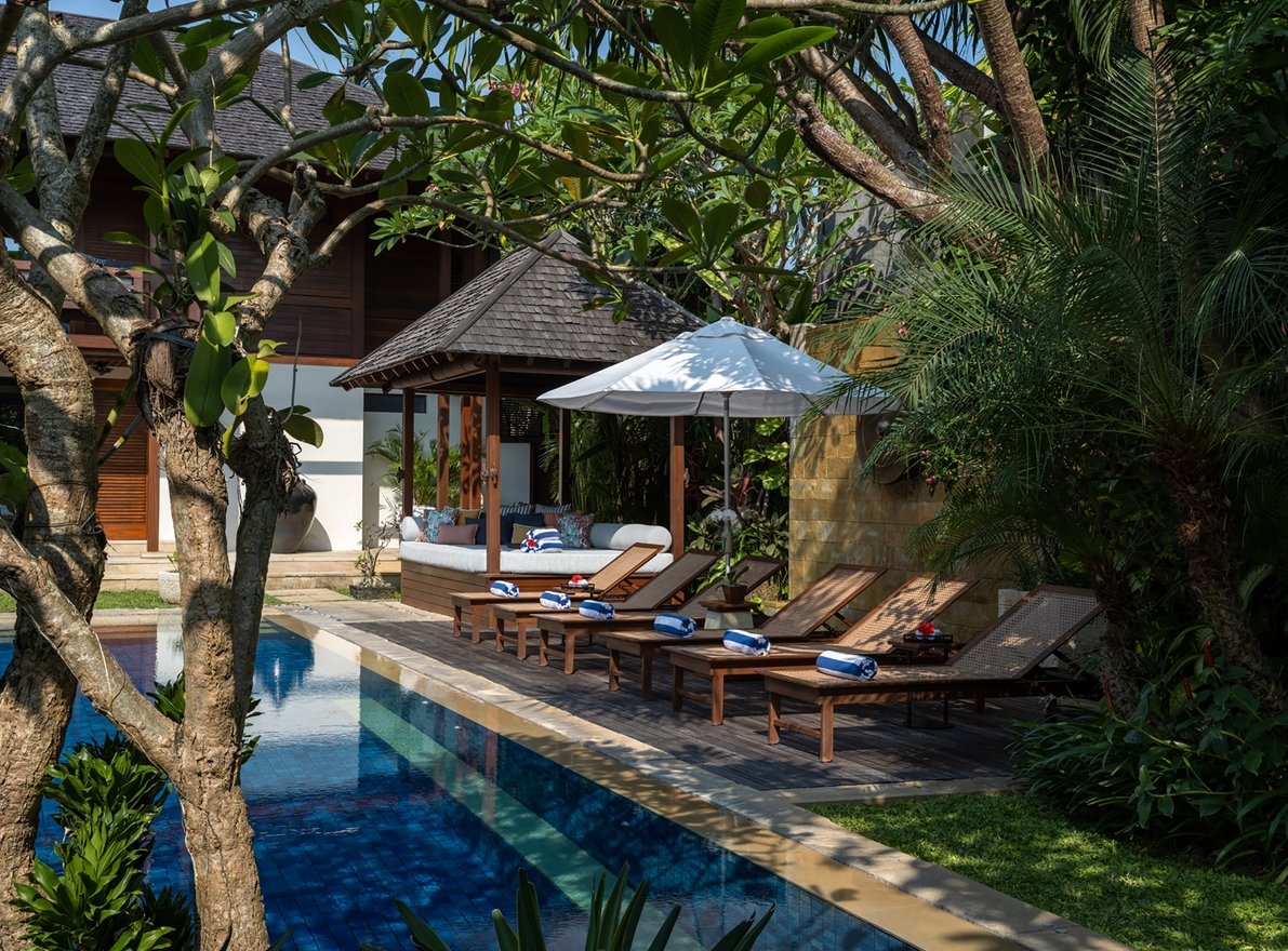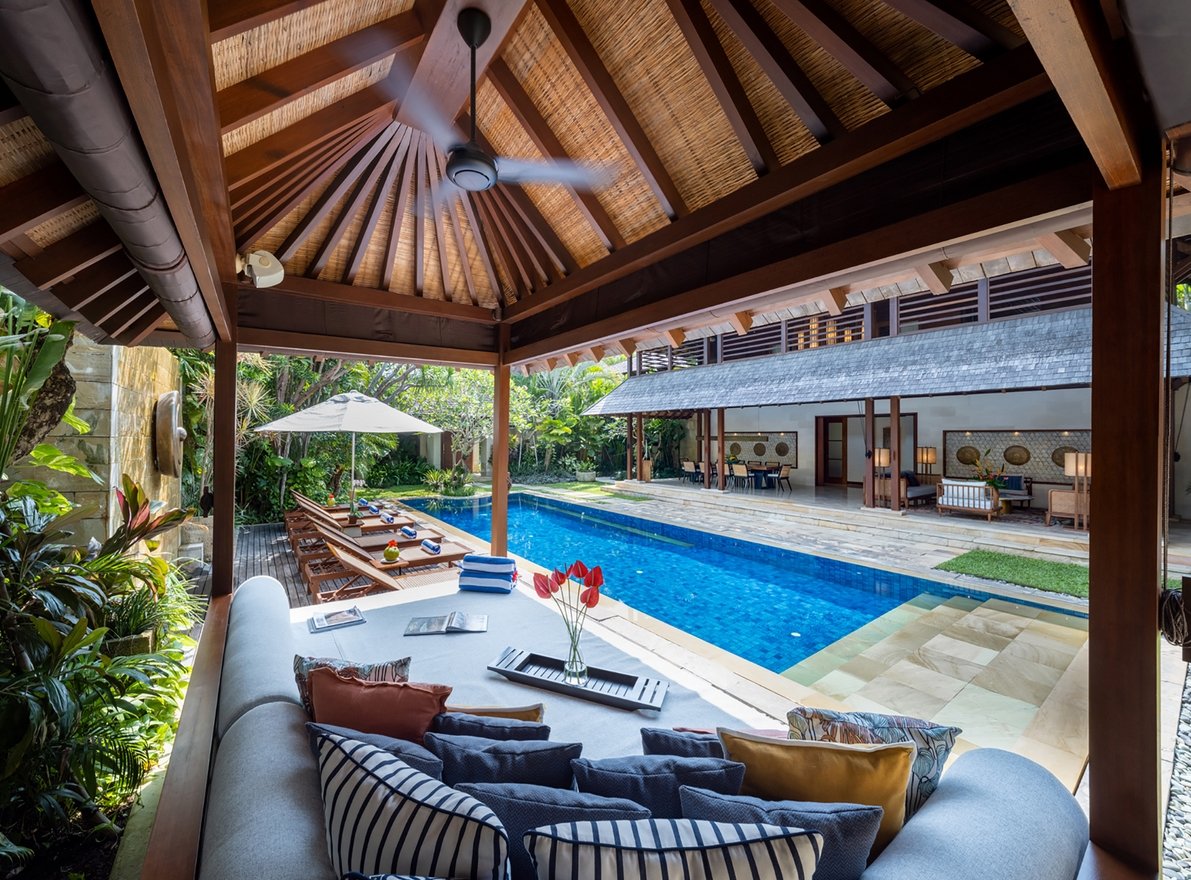 Set amidst lush tropical gardens, this elegant 5-bedroom villa surrounds a stunning 14-metre private pool with sun loungers perfect for soaking up the Bali sunshine.