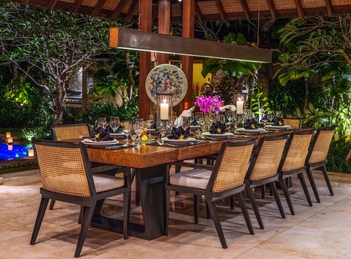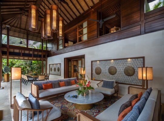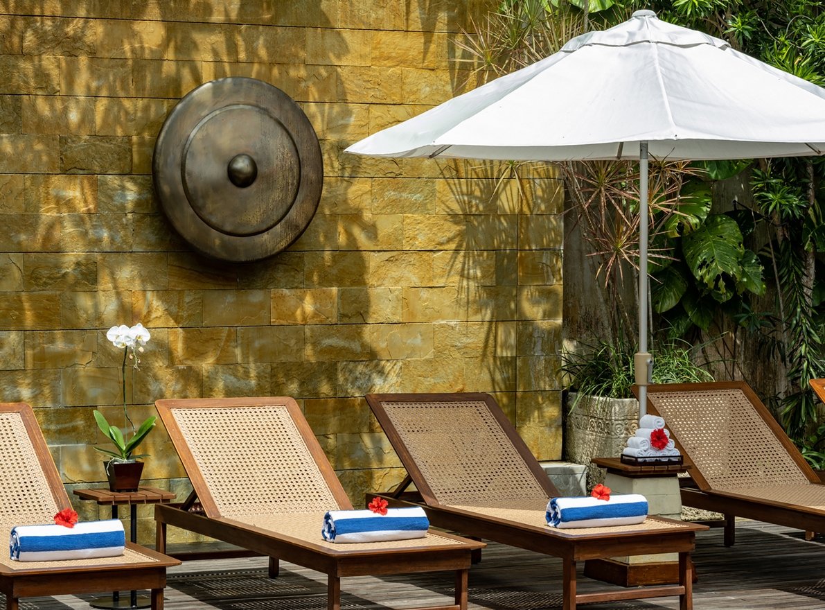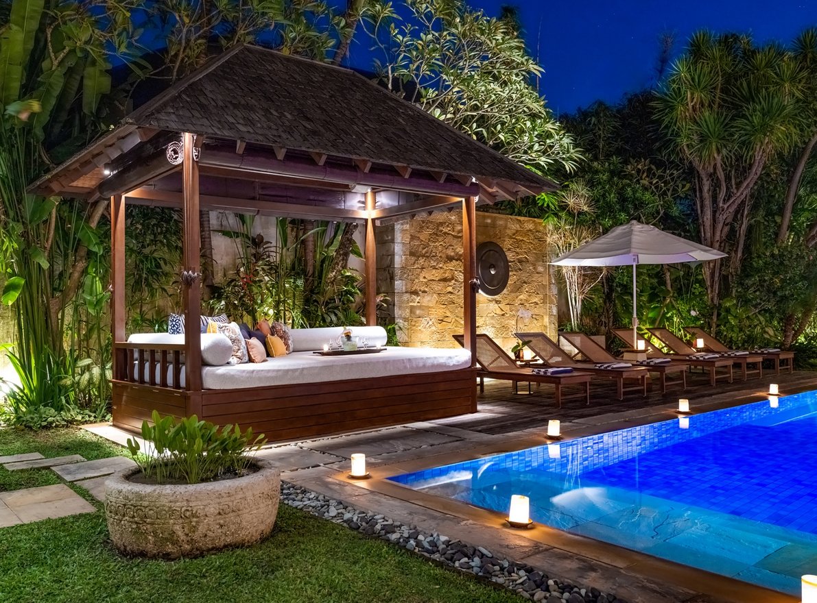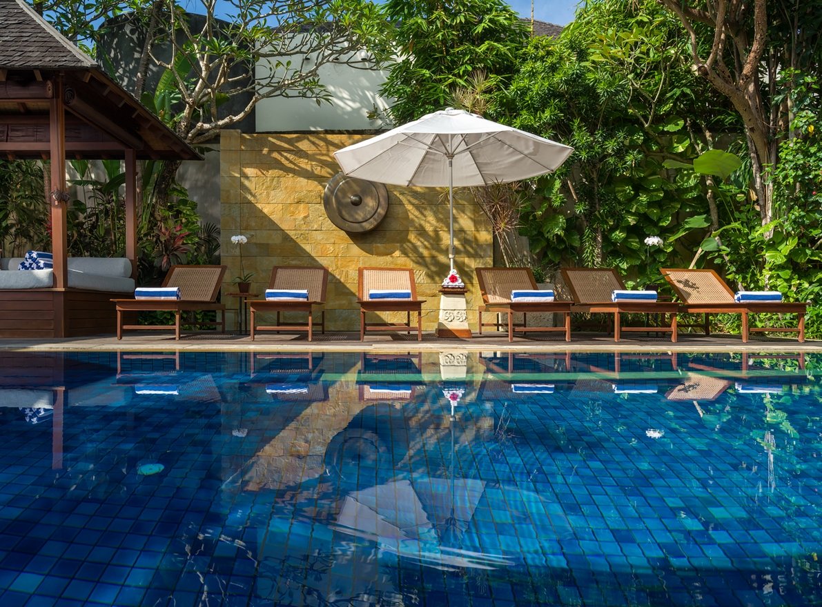 Set amidst lush tropical gardens, this elegant 5-bedroom villa surrounds a stunning 14-metre private pool with sun loungers perfect for soaking up the Bali sunshine.