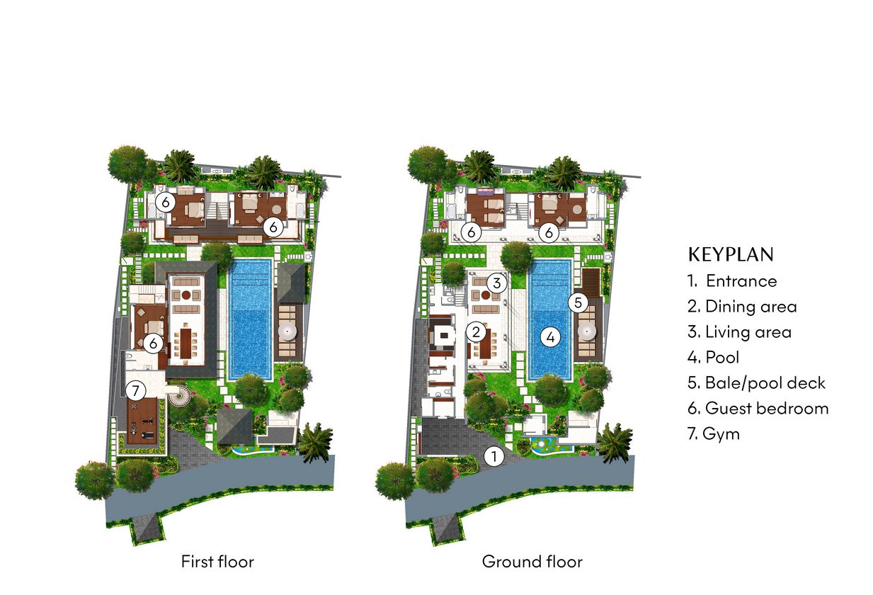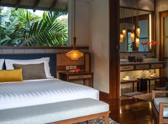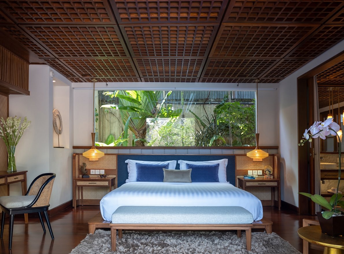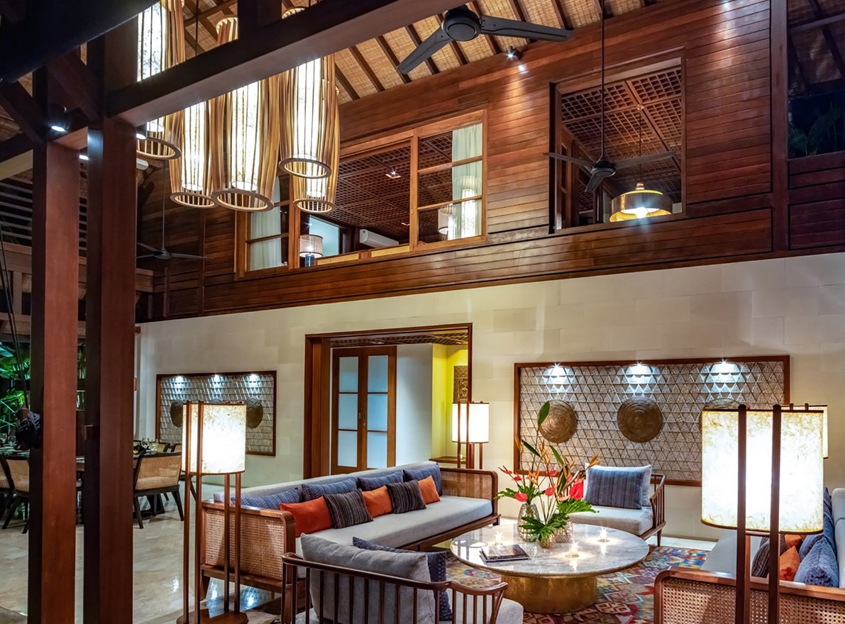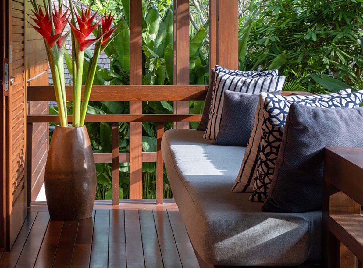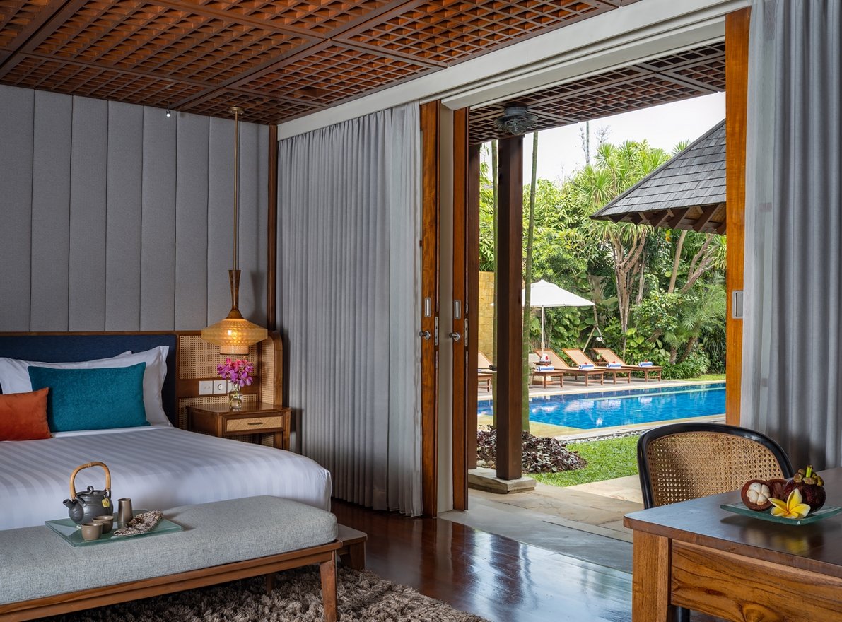 Set amidst lush tropical gardens, this elegant 5-bedroom villa surrounds a stunning 14-metre private pool with sun loungers perfect for soaking up the Bali sunshine.