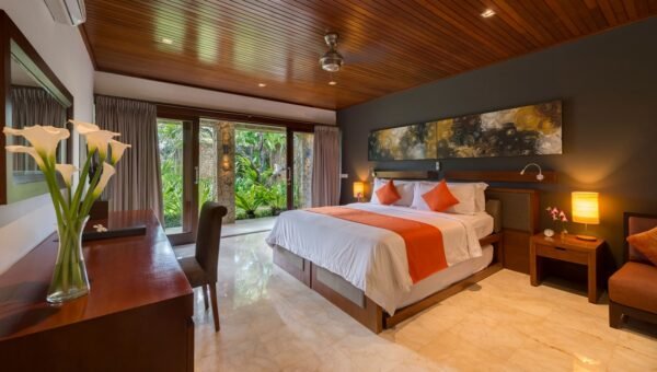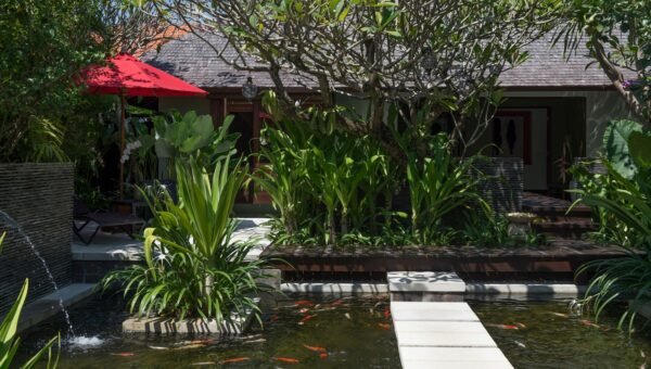 This fully staffed 5-bedroom tropical villa is a dream for active families or groups seeking space, privacy, and endless entertainment. Just a short stroll to Batubelig Beach and a quick 5-minute drive to Seminyak, the villa features two pools, koi ponds, a massive games room, and free access to Finns Recreation Club — all wrapped in a lush tropical setting.