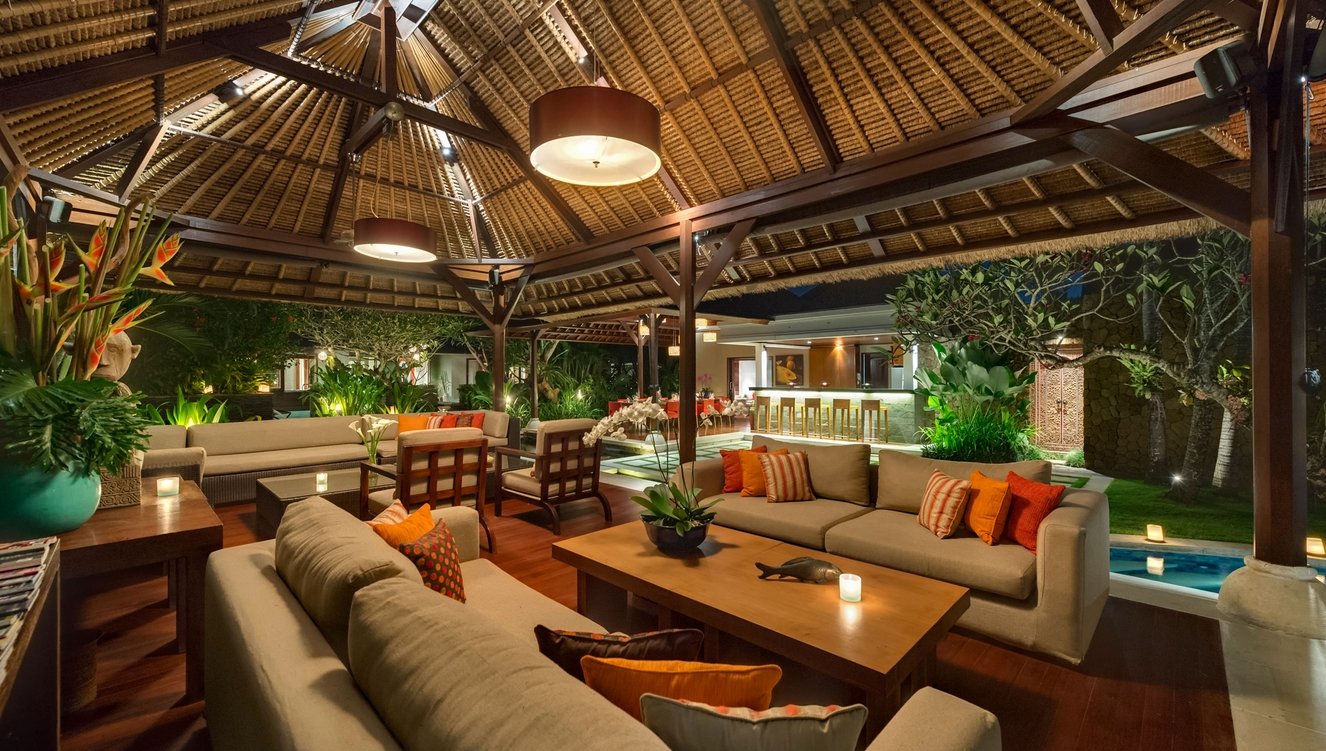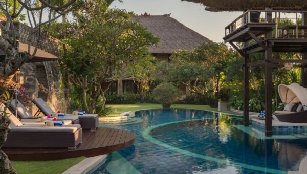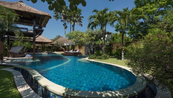 The villa is a fully staffed five-bedroom residence an easy walk from Batubelig Beach on Bali’s south-west coast, and a five-minute drive from Seminyak. With a spectacular free-form swimming pool, a large plunge pool, massive games room, TV room, and membership of the Finns Recreation Club.