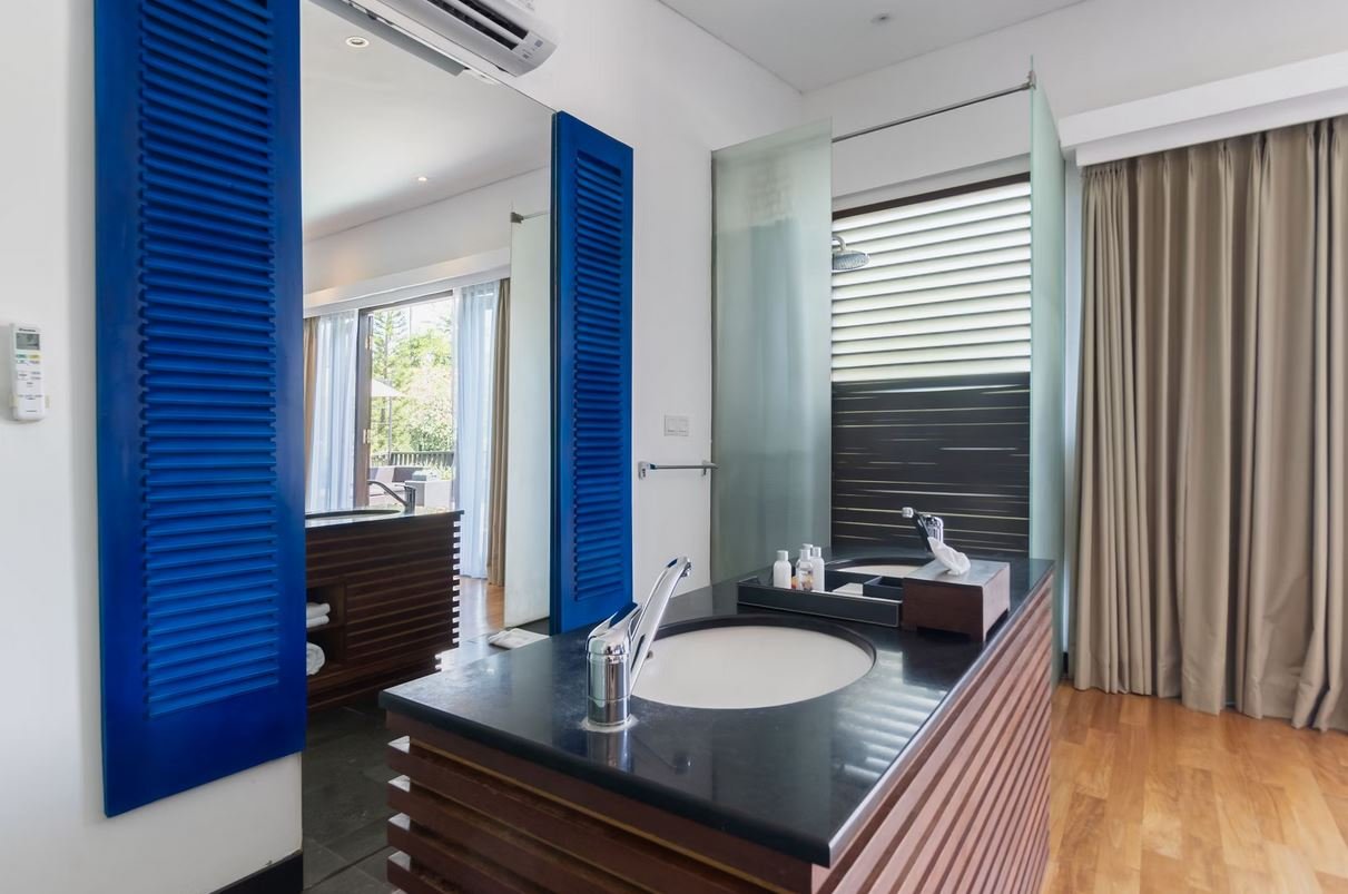 Enjoy direct access from the bedroom to your private pool, complete with a plush sofa sunbed perfect for soaking up the sun or stargazing at night. The air-conditioned space features calming blue tones, a cozy living and dining area, and a spacious bathroom with both a bathtub and a rain shower.