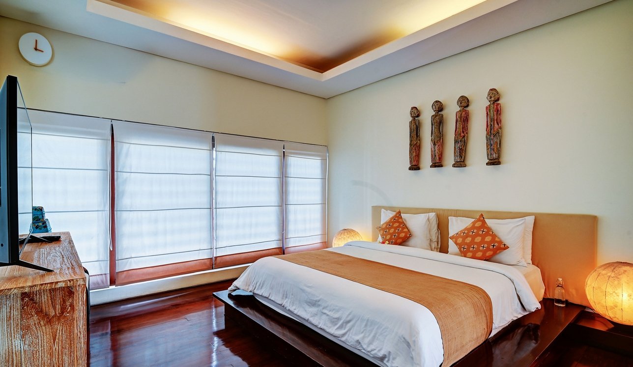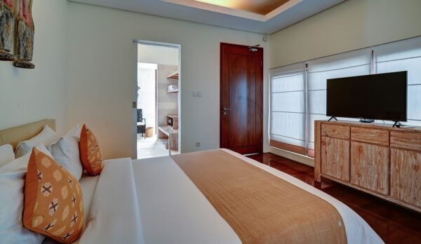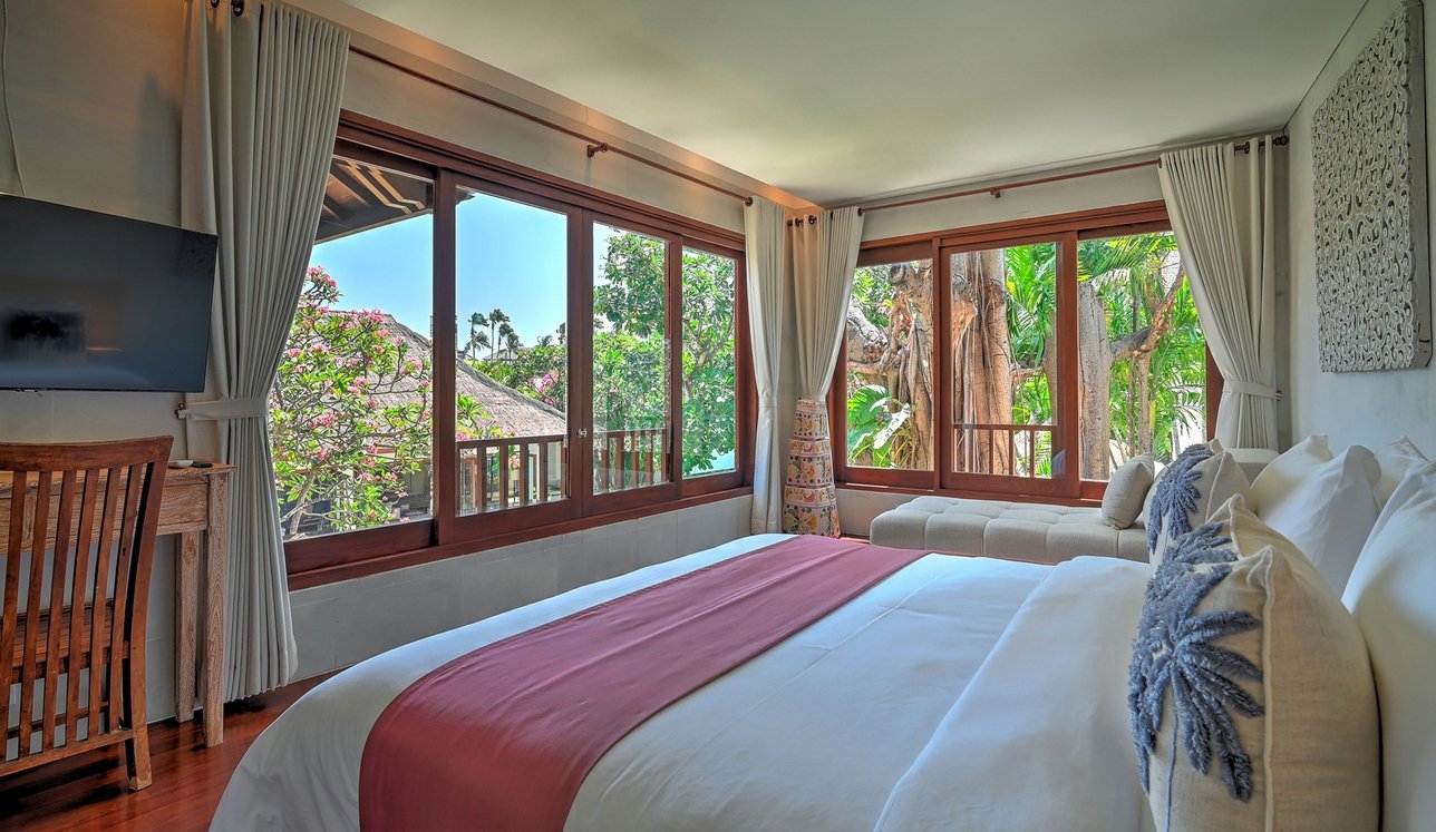 Each bedroom is designed for comfort and privacy, with ensuite bathrooms and TVs. The downstairs master suite boasts a spa-like bathroom, while the upstairs rooms open to balconies overlooking the gardens. Kids will love their own bunk room, comfortably sleeping up to five—perfect for cousins or friends traveling together. This villa is as family-friendly as it is luxurious.