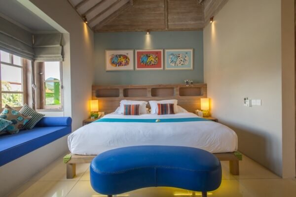 The villa’s interiors reflect a modern tropical design, decorated with custom wooden furniture, vibrant artworks, and warm lighting that creates a cozy yet sophisticated atmosphere. With a seamless layout centered around a 12-meter swimming pool and lush garden, every corner invites you to unwind and feel at home.