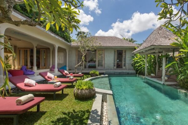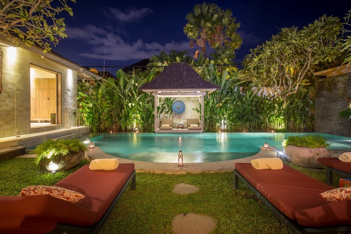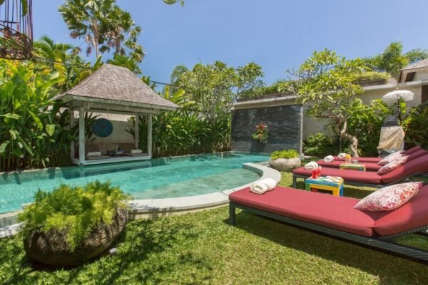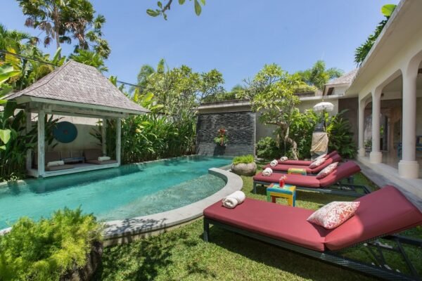At the heart of the villa lies a 12 x 4 meter private swimming pool, surrounded by sun loungers and a shaded bale for lazy afternoons. The tropical garden frames the space beautifully, giving it a secluded, relaxing feel despite its central location.